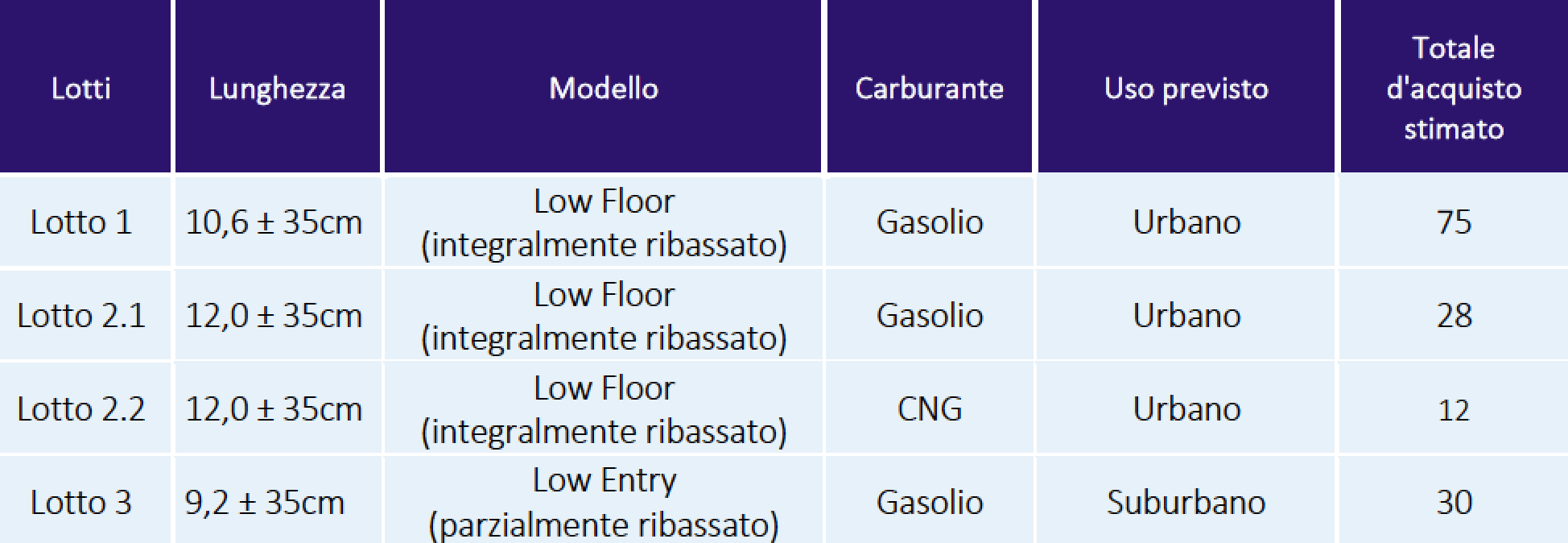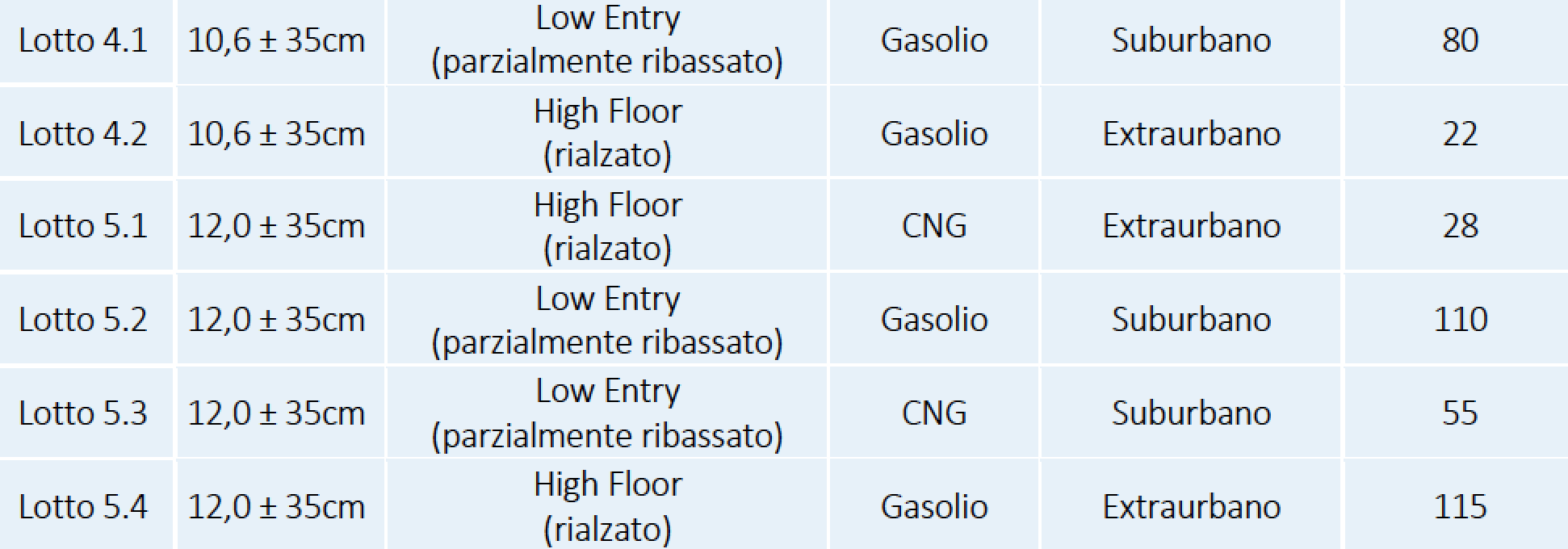 La gara, come già accennato, contempla due lotti, uno per autobus urbani e un altro per autobus Classe II. Entrambi presentano profili stringenti in termini di affidabilità e sul piano della manutenzione e dettano regole contrattuali molto precise in termini di disponibilità e costi dei ricambi. La procedura è organizzata in n°10 lotti distinti ciascuno corrispondente ad una determinata tipologia di autobus. Ogni lotto sarà fatto oggetto di aggiudicazione separata e di uno specifico Accordo Quadro per un totale di 123,815 milioni di euro con consegna a 12 mesi dalla data dell’ordine.