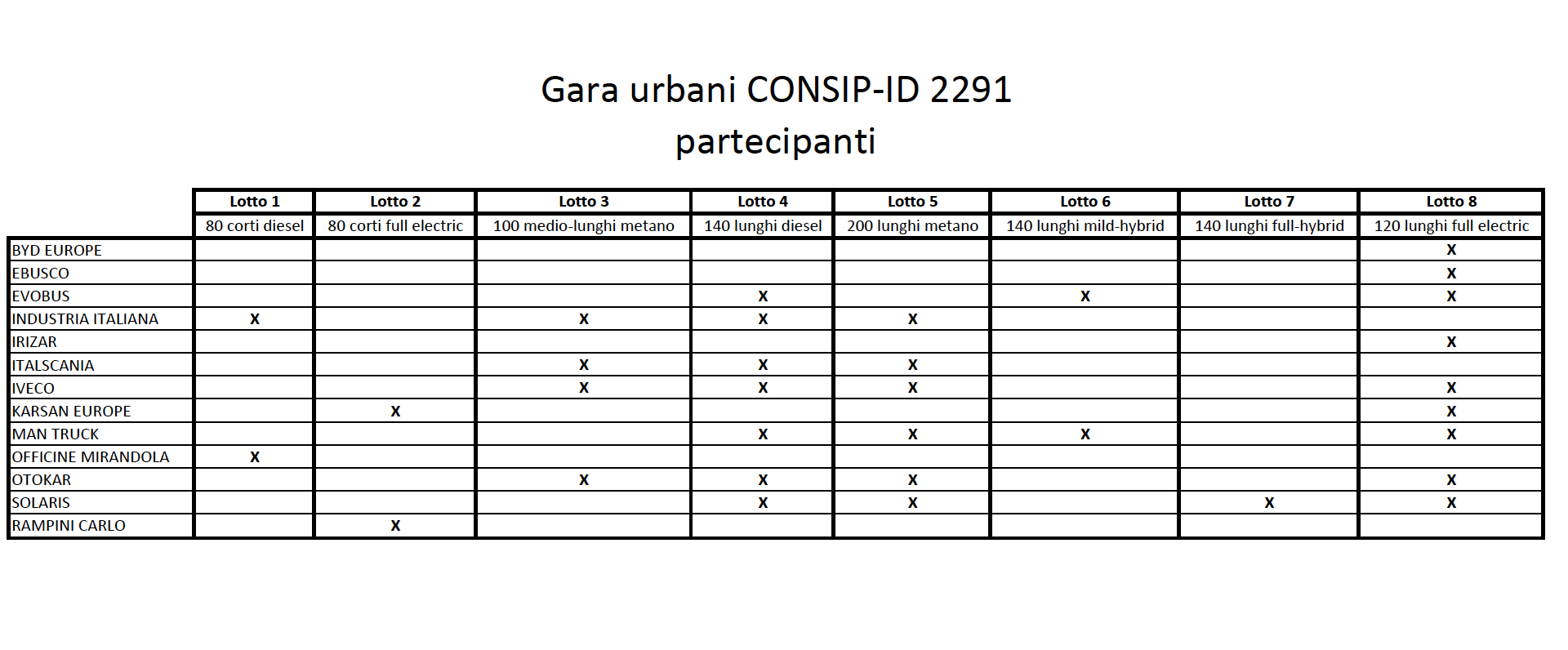 - Lotto 8: Man, Solaris, Otokar, Iveco, Irizar, Evobus, Bbusco, Karsan, Byd