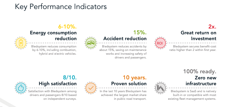 Bledsystem, la soluzione leader di guida ecologica per flotte di autobus, offre tecnologie e metodi SaaS (Software as a Service) all’avanguardia per aiutare a migliorare l’efficienza delle flotte di autobus, sia in termini di guida che di operazioni, riducendo anche il tasso di incidenti. Tutto questo migliorando l’esperienza e il comfort del personale e dei clienti.