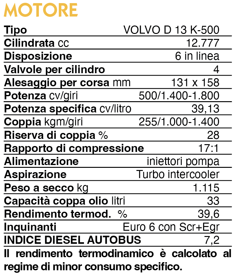 Il Volvo 9700 Dd che abbiamo provato su strada è equipaggiato con un motore a 6 cilindri in linea con una cilindrata di 13 litri, capace di erogare una potenza di 500 cavalli e una coppia di 2.500 Nm. Un motore già compatibile con il biodiesel (B100), con il gasolio E590 e con gli olii vegetali idrogenati Hvo. Al propulsore è abbinato il cambio automatizzato I-Shift con possibilità di selezionare la modalità totalmente automatica o quella manuale sequenziale. Lo sterzo, combinato ad un servosterzo idraulico, permette un angolo di sterzatura delle ruote anteriori fino a 52 gradi, un angolo di tutto rispetto specialmente in considerazione delle importanti dimensioni del mezzo. Il 14,1 metri a nostra disposizione presenta un raggio di sterzata tra muri inferiore ai 12 m; idraulico è anche il sistema di comando del terzo asse sterzante.