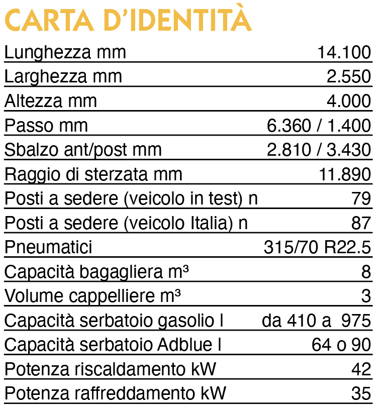 Disponibile in tre diverse lunghezze (13, 14,1 e 14,8 metri), si avvantaggia di una struttura modulare che permette di ottenere le diverse lunghezze solamente variando il passo tra primo e secondo asse. Abbiamo provato la versione intermedia, in una configurazione dal ‘gusto’ centro-europeo. Tra le differenze con la versione a disposizione del mercato italiano c’è la capacità passeggeri (79 sedute sull’autobus provato, 87 sul due piani per lo ‘stivale’). Per l’Italia è previsto anche lo spazio per disabili con la relativa rampa d’accesso.