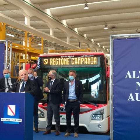 Iveco Bus. In occasione della visita del Presidente della Regione Campania Vincenzo De Luca agli stabilimenti ferroviari della FIREMA SPA di Caserta è stata presentata una prima parte dei veicoli che Agenzia Campana per la Mobilità le Infrastrutture e le Reti – ACaMIR ha acquistato per l’implementazione del parco macchine destinato al TPL della regione Campania.