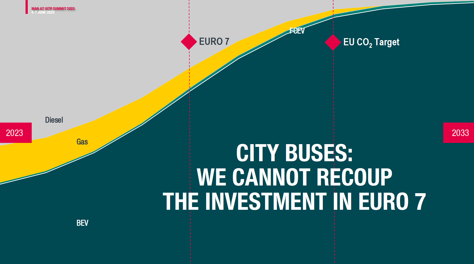 “Nel 2030 non venderemo alcun autobus urbano con motore a combustione in Europa. Gli standard Euro 7 mettono gli OEM in una situazione difficile: non è possibile sviluppare l’Euro 7 per l’intera gamma, gli investimenti per il segmento di Classe I non verrebbero mai recuperati. Guardando all’evoluzione del mercato degli autobus urbani in Europa, non vediamo un mercato in futuro per le trazioni a gas. Vediamo spazio per gli autobus a celle a combustibile, ma non più del 10% del mercato degli autobus”, ha dichiarato Heinz Kiess, Head of Product Marketing Bus, MAN Truck & Bus, durante la conferenza stampa tenutasi oggi, 4 giugno, a Barcellona, prima dell’inizio del Summit UITP 2023.