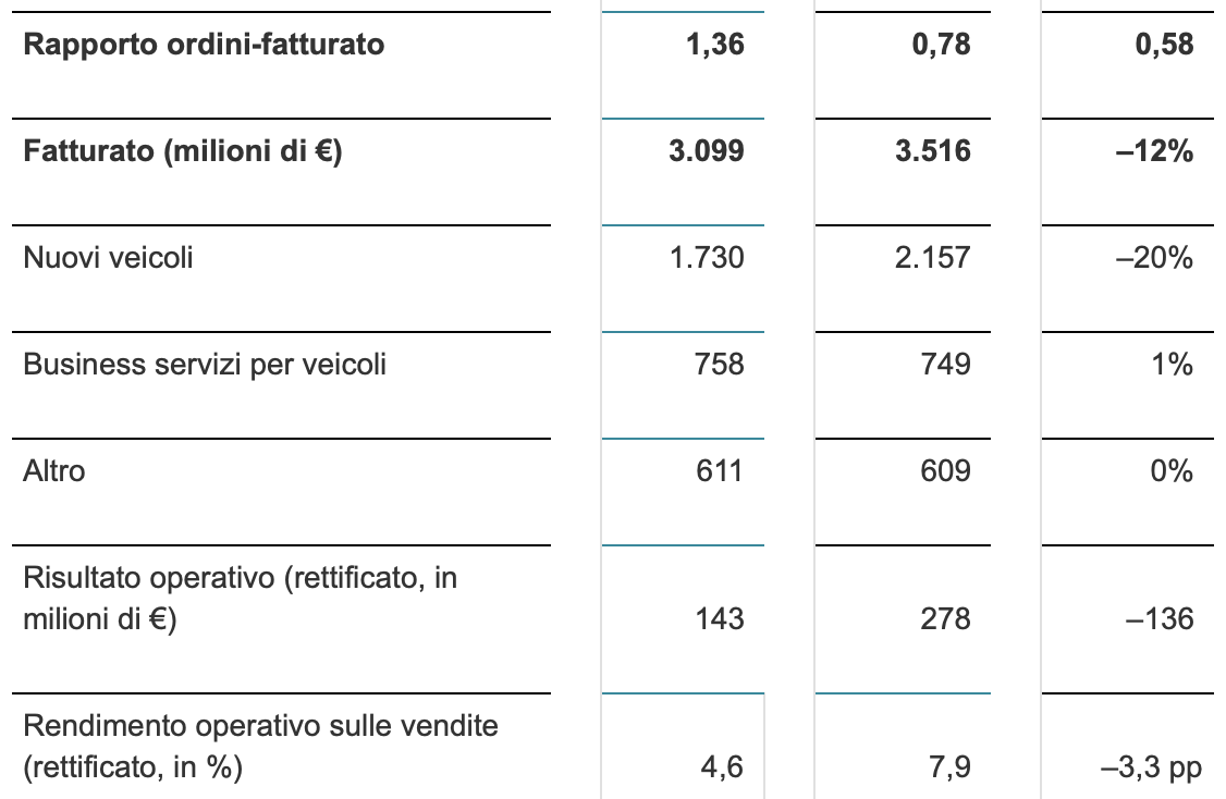La conseguenza di questi numeri sul fatturato di MAN, pari a quasi 3,1 miliardi di euro, è un -12% rispetto all’anno scorso. Con 143 milioni di euro, il risultato operativo rettificato è sceso significativamente al di sotto della cifra dell’anno precedente (-136 milioni di euro), soprattutto a causa dei minori volumi di vendita e dei maggiori costi. Il rendimento operativo rettificato sulle vendite ha raggiunto il 4,6% ed è stato quindi inferiore di 3,3 punti percentuali rispetto allo stesso periodo dell’anno precedente.