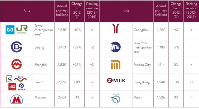 Le città asiatiche si confermano prime al mondo per l’estensione delle loro reti delle metropolitane e per il numero di passeggeri trasportati. È questo quello che emerge dall’ultimo report pubblicato da UITP, l’Associazione internazionale del trasporto pubblico, sullo stato dei network metropolitani e sui loro potenziali futuri sviluppi. A scalare la classifica è la città di Tokyo che detiene il primato per il più trafficato sistema di metro al mondo con oltre 3,6 miliardi di viaggi effettuati ogni anno e una crescita del 10% rispetto al 2012. Subito dietro altre tre città asiatiche: Pechino, Shanghai e Seoul. Ad aumentare non sono però solo i passeggeri, ma è anche l’automazione: a distanza di 40 anni dal lancio della prima metropolitana automatizzata, oggi circa un quarto dei sistemi di metropolitane al mondo hanno almeno una linea con guida automatica.