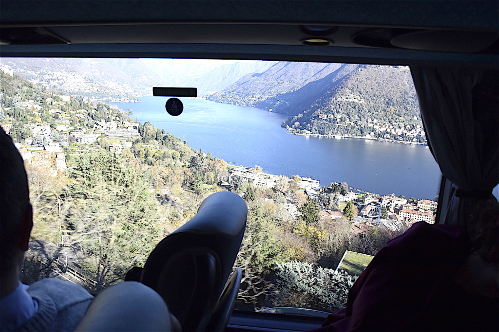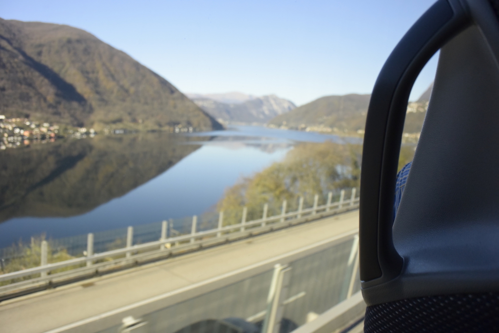 Da qui inizia lo spettacolo, soprattutto per noi che viaggiamo al piano alto. La vista è davvero impagabile soprattutto per chi ha sempre solcato queste strada a raso asfalto seduto sulla propria automobile. Si rimane a bocca aperta davanti ai colori di un autunno arancione giallo che si rispecchia nei laghi svizzeri.