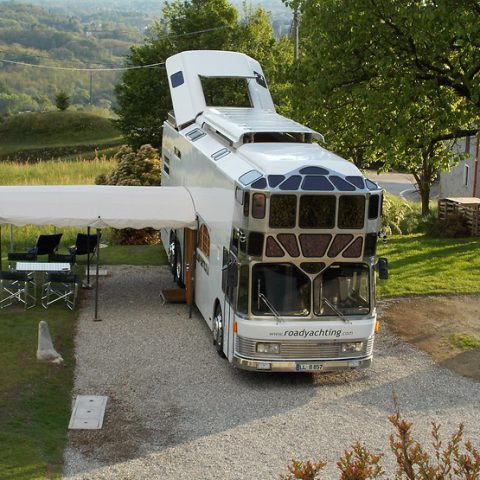 La prima vita da autobus, la seconda vita da casa mobile. É il destino di un Neoplan Skyliner degli anni ’70, convertito in Roadyacht e collocato poco distante dal lago Maggiore. Ma il mezzo non è fatto per stare fermo: può essere infatti noleggiato come casa mobile e spostato secondo i desideri dei viaggiatori. Insomma: un autobus che, superato il fiore degli anni, esula dal suo compito di mezzo di trasporto per trasformarsi in meta del soggiorno.