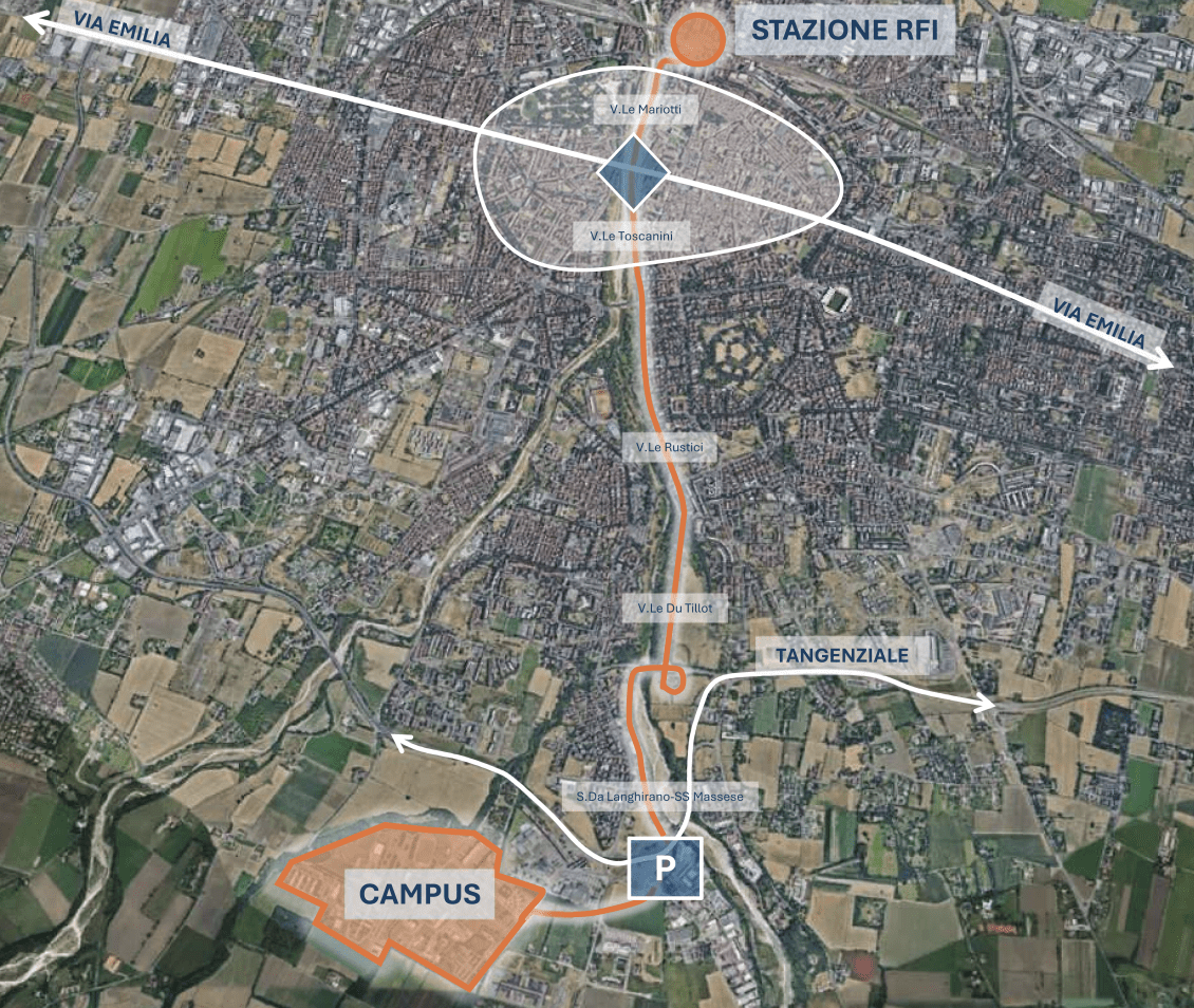 La nuova linea collegherà la stazione ferroviaria con il Campus Universitario, lungo l’asse Nord-Sud, transitando viale Mariotti, incrociando la via Emilia, quindi proseguendo per viale Toscanini, viale Rustici, il parcheggio sud e il Campus Universitario. Sarà così possibile raggiungere comodamente e in pochi minuti il Campus dalla stazione e dal centro, facilitando gli spostamenti dei tanti studenti che provengono anche dalla provincia e da altre città. Il parcheggio sud diventerà un hub che consentirà facili interscambi con i collegamenti delle frazioni della zona sud di Parma.