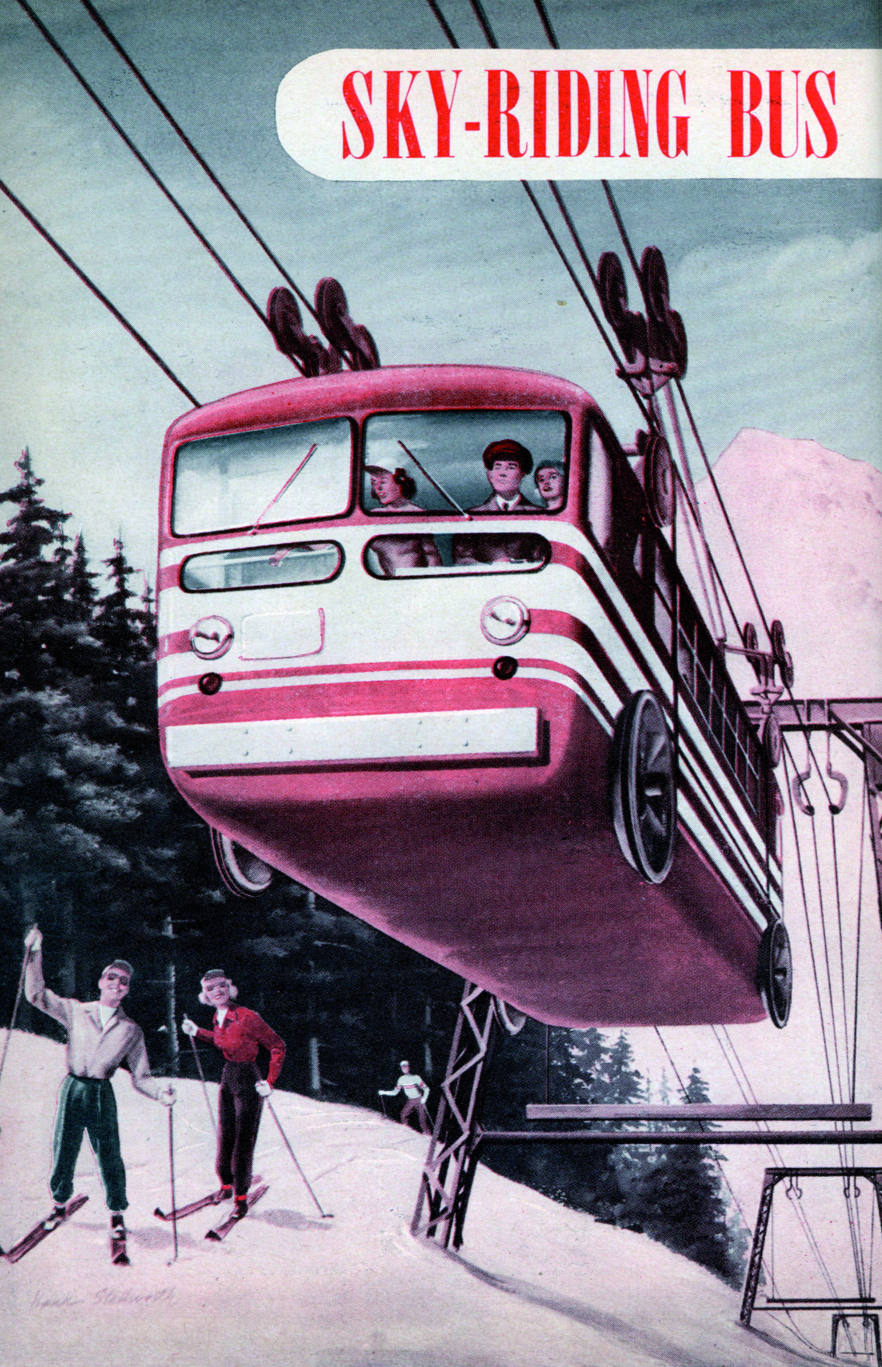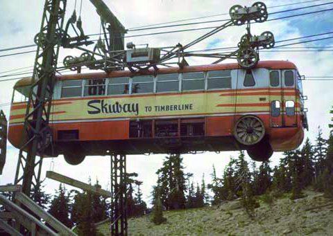 Quanti ricordano il film “Shining” con Jack Nicholson? Probabilmente molti. Pochi però sanno che l’Overlook Hotel, dove si svolge la storia, è in realtà il Timberline Lodge sul Monte Hood, nota località sciistica dell’Oregon. Nel 1937, anno della sua costruzione, vi era un’unica tortuosa strada forestale, spesso interrotta per neve. Il crescente interesse per lo sci richiedeva una soluzione alternativa. Nel 1946 lo sciatore W.D.B. Dadson, assieme al medico Otto George, fondò la società Mount Hood Aerial Transportation Company senza però avere chiare idee su cosa fare, anche perché la tecnica per gli impianti di risalita era ancora agli inizi. Myrl Hoover, proprietario di una piccola azienda di autobus, suggerì di modificare dei veicoli stradali per viaggiare sospesi a funi di acciaio. Coinvolsero così un costruttore di attrezzature per boscaioli, la Pointer-Willamette, per modificare due autobus Kenworth e per adattare al servizio “passeggeri” ganci, sospensioni, pulegge normalmente usate per le teleferiche merci. L’entusiasmo per l’iniziativa, anche attraverso una martellante pubblicità su alcune riviste sportive e turistiche, convinse 425 privati sciatori ad acquistare azioni della società che avrebbe di lì a poco realizzato la più lunga funivia del mondo. Qualcuno la definì la “Chitty Chitty Bang Bang delle montagne”, altri usarono il termine “cloudliner”.