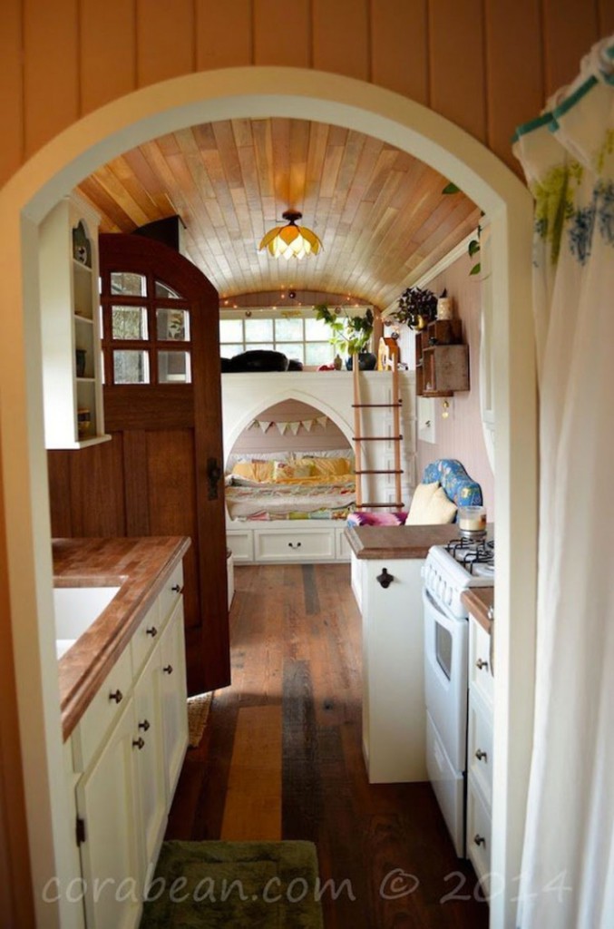 Perché destinare alla rottamazione un autobus ancora funzionante quando si può dargli una seconda vita? È quello che devono aver pensato Jeremy e Mira Thomson, una coppia statunitense che ha trasformato uno scuolabus in un alloggio a sei ruote. Dall’interno può sembrare una casa tradizionale, seppur piccola, mentre dall’esterno è impossibile confondersi: internamente, infatti, sono stati asportati tutti gli arredi originali, mentre esternamente parte della livrea è stata ricoperta con legno di credo, anche se la porta anteriore e la cabina di guida rispecchiano ancora la forma tradizionale degli scuolabus americani. Dal tocco un po’ rustico ma decisamente accogliente, la casa su sei ruote da 11 metri è dotata di ogni comfort, forno compreso.