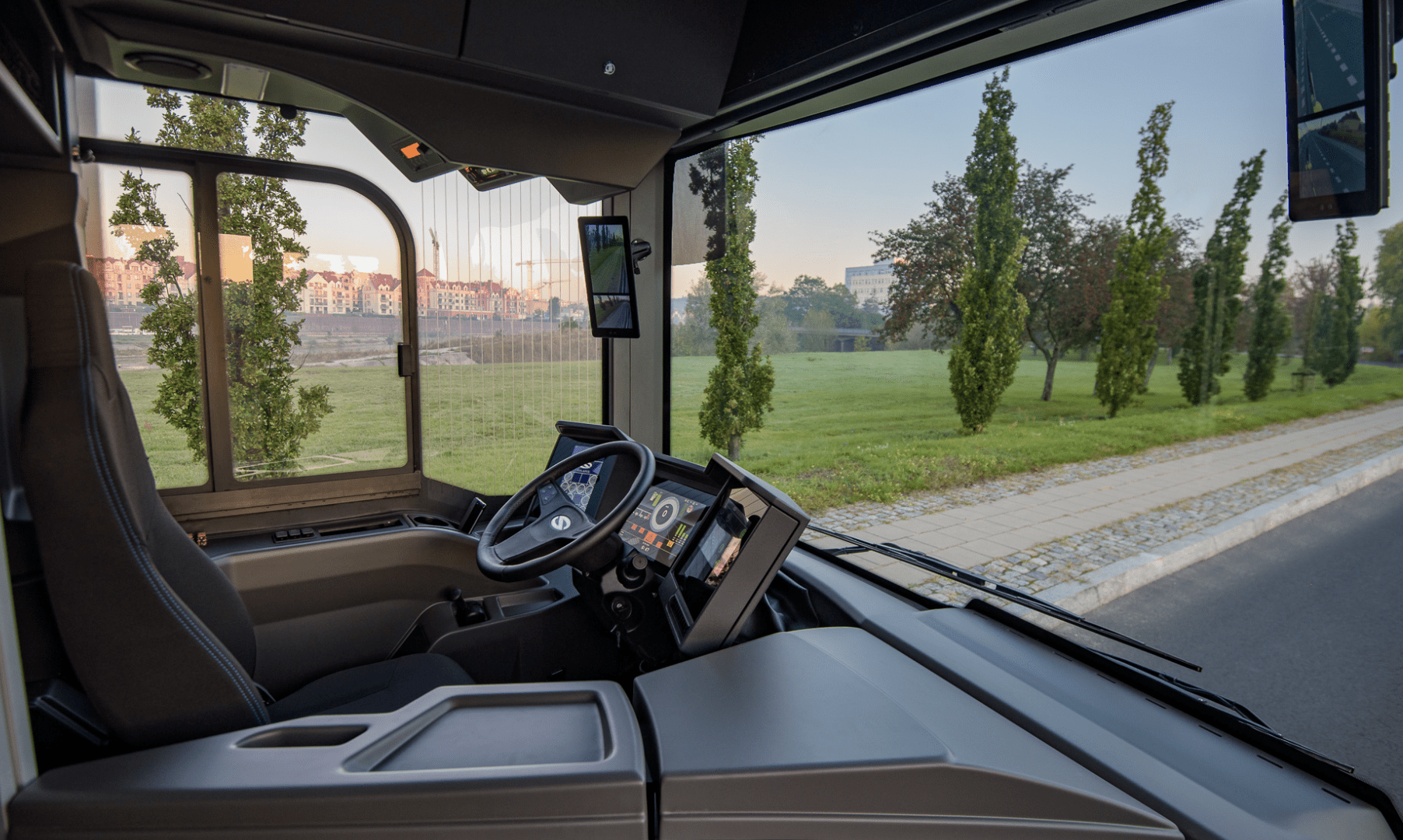 Di impostazione abbastanza tradizionale il posto guida, con cruscotto regolabile e solidale al volante e conforme alle norme Vdv, integrato da una pratica plancia posta a sinistra del conducente e da spazi per ulteriori comandi e centraline sopra la testa dell’autista. Il sedile di marca Isri o Grammer è di tipo pneumatico con regolazione lombare, cui possono essere abbinate le funzioni di riscaldamento del cuscino e ventilazione dello schienale.