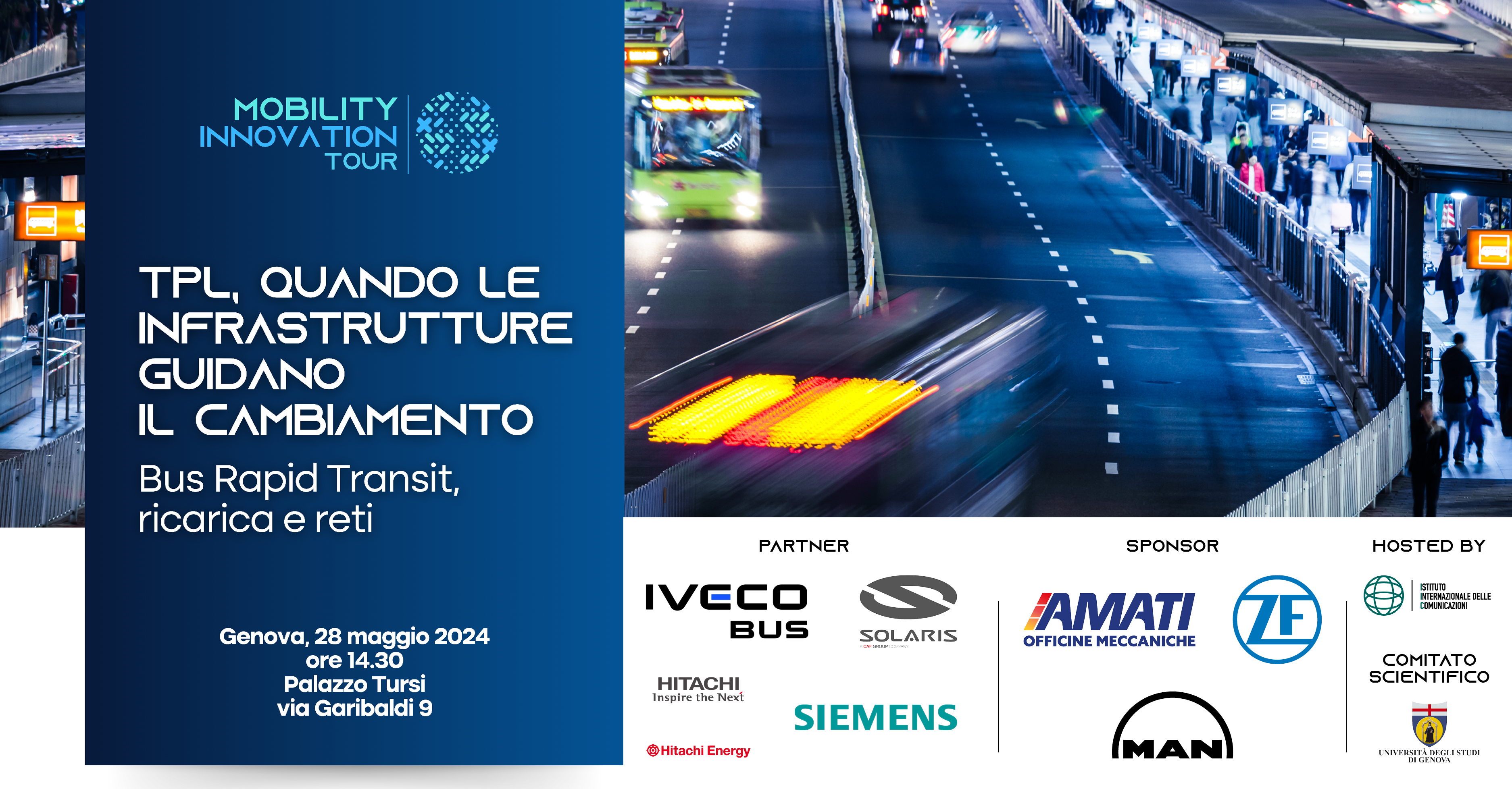 Martedì 28 maggio alle ore 14:30, presso il Salone di Rappresentanza di Palazzo Tursi (via Garibaldi 9), a Genova, torna il Mobility Innovation Tour: “Tpl, quando le infrastrutture guidano il cambiamento: Brt, ricarica e reti“, il titolo del convegno.