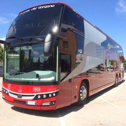 Ferrovie del Gargano alza l’asticella dei servizi granturismo con tre bipiano Beulas Jewel su telaio Scania pronti a scendere in strada sulle tratte che collegano il Gargano alle città di Milano e Torino. Il plus? Appena 66 posti a bordo distribuiti su oltre 14 metri di lunghezza, per garantire la massima comodità nei lunghi trasferimenti in bus.