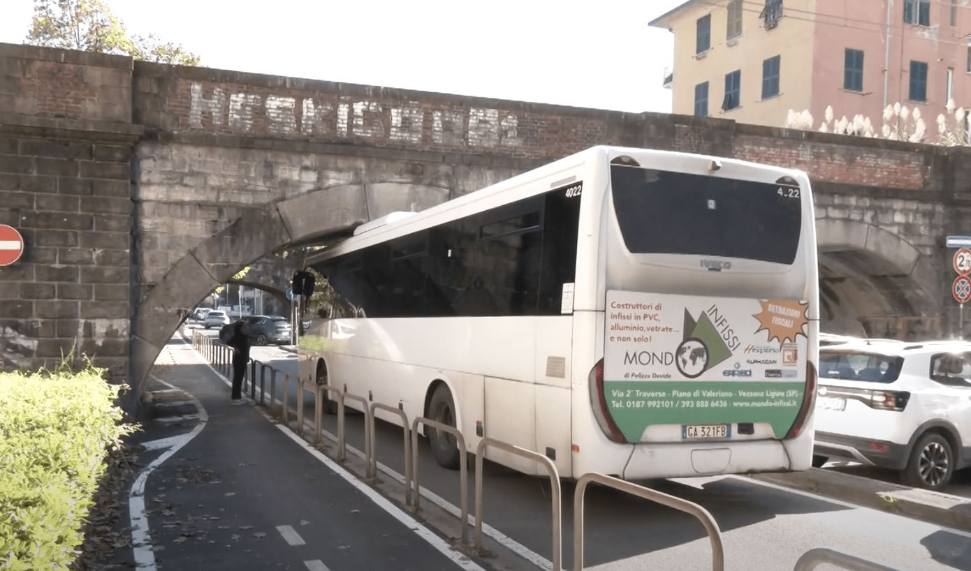 A La Spezia un autobus si incastra sotto il ponte della ferrovia. Soluzione? Sgonfiare i pneumatici…