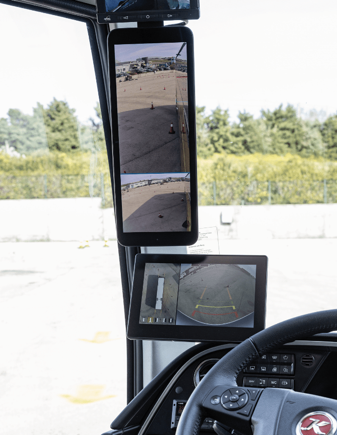 In luogo dei tradizionali specchi retrovisori esterni, l’intera gamma Mercedes-Benz e Setra può oggi essere equipaggiata opzionalmente con il sistema MirrorCam. Oltre a rendere più snello l’aspetto del veicolo, questa possibilità ha numerosi vantaggi in termini di funzionalità e sicurezza: il campo visivo dell’autista è più esteso e la luminosità viene regolata in funzione della visibilità e dell’illuminazione esterna.Â