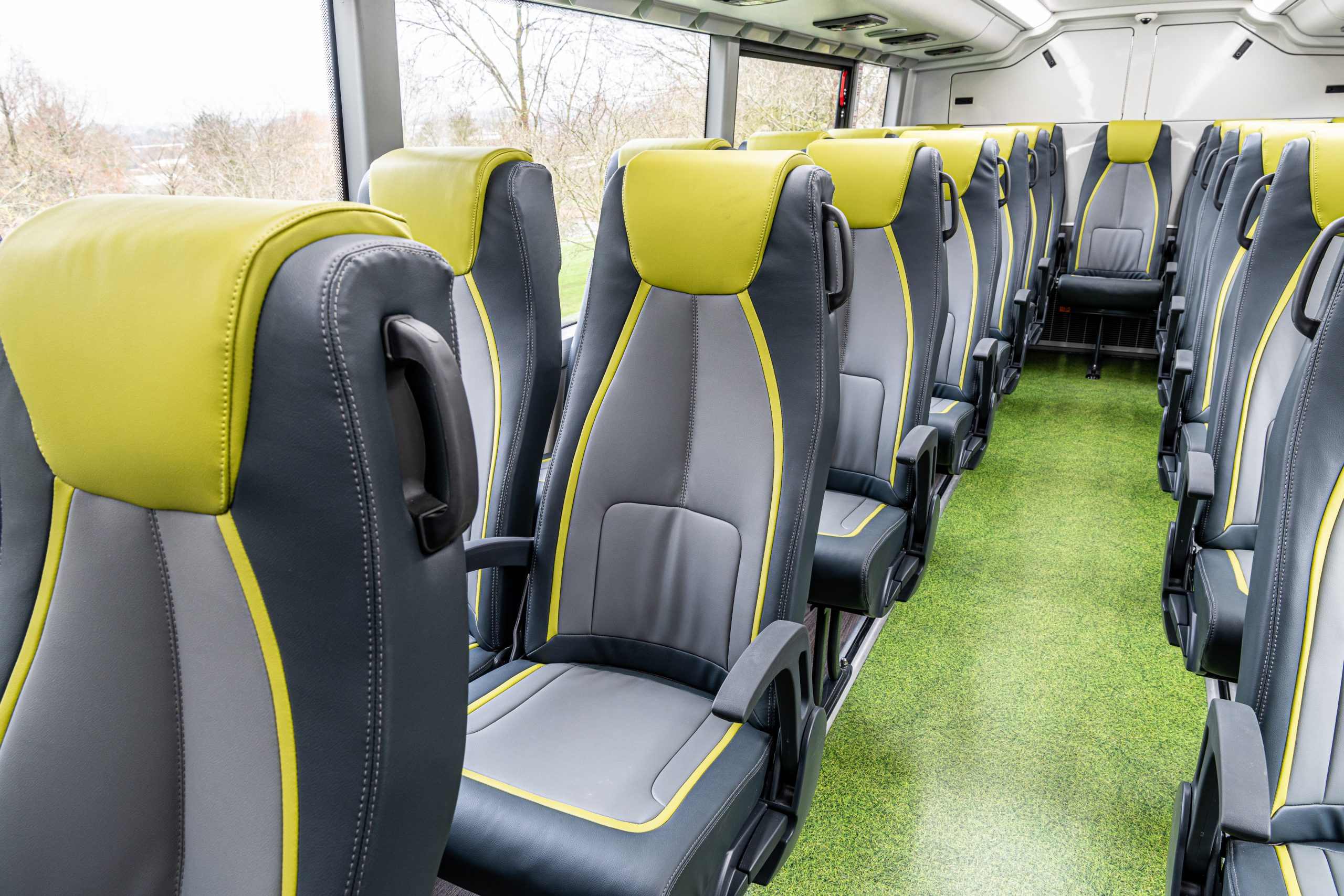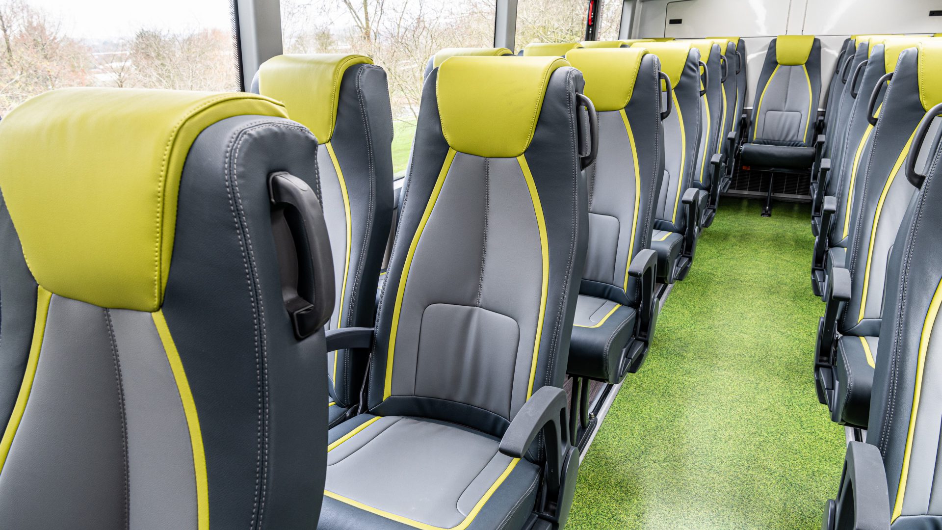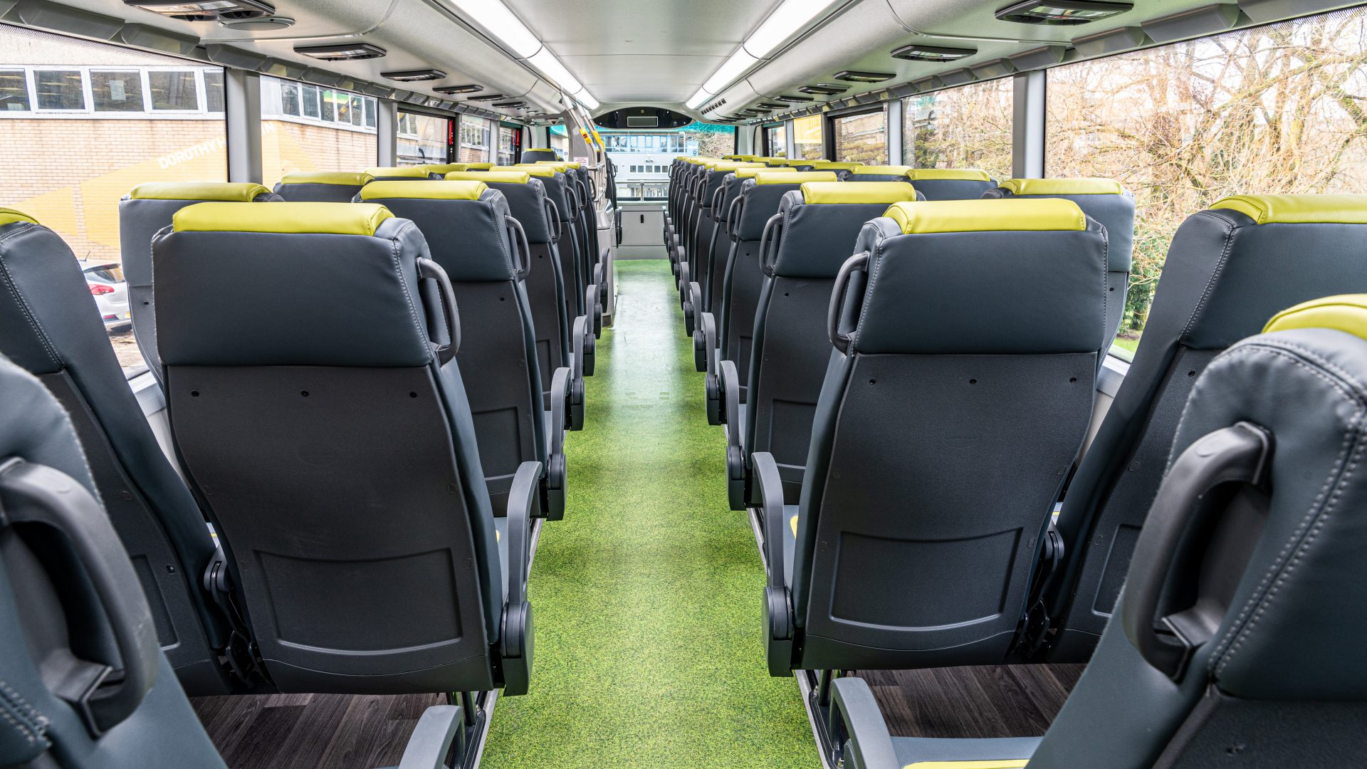 I sedili portano la firma Lazzerini e sono rivestiti totalmente in eco pelle bicolore. Al piano inferiore troviamo entrambe le versioni del modello Pratico 3840 a schienale alto e Pratico 3845 a schienale basso, entrambi fissi (non reclinabili) con doppia imbottitura e bracciolo alzabile lato corridoio Al piano superiore sempre sedili Lazzerini ma questa volta si tratta del modello GTST – Gran Turismo/Transito – nella versione lusso, alcuni a schienale fisso ed altri reclinabili, sempre con doppia imbottitura e appoggiatesta rialzato ed imbottito e con bracciolo abbattibile lato corridoio e maniglia laterale.