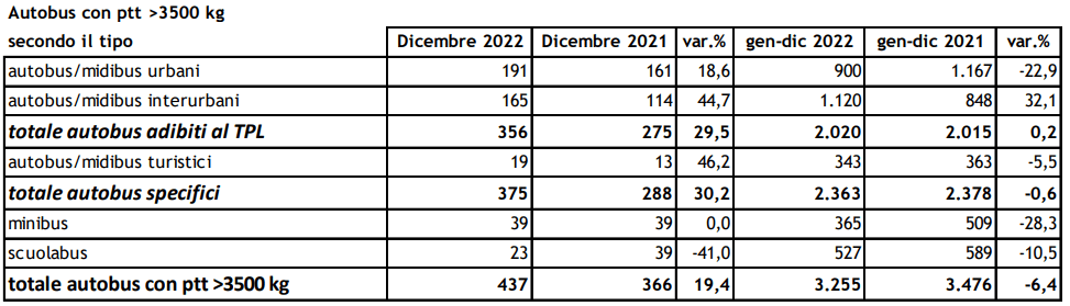 Il mercato degli autobus con massa a pieno carico (ppt) superiore a 3.500 kg totalizza a dicembre 2022 437 nuove unità , con un incremento del 19,4% rispetto a dicembre 2021. Questa la fotografia scattata dall’Anfia, Associazione Nazionale Filiera Industria Automobilistica.
