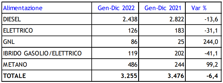 Secondo l’alimentazione, la quota di mercato degli autobus alimentati gas è del 17,6% nel periodo gennaio-dicembre 2022 (contro il 7,7% di gennaio-dicembre 2021), mentre gli elettrici e ibridi gasolio/elettrico rappresentano il 7,5% (11% nel 2021).