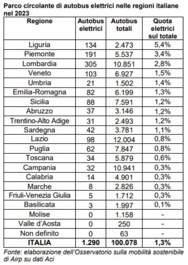 Le quote più basse di autobus elettrici sul totale di autobus in circolazione, dello 0,3%, si rilevano in Campania, Calabria, Marche e Friuli-Venezia Giulia, mentre la Basilicata non supera lo 0,1% e Molise e Valle d’Aosta risultano le uniche regioni italiane prive di autobus elettrici in circolazione.