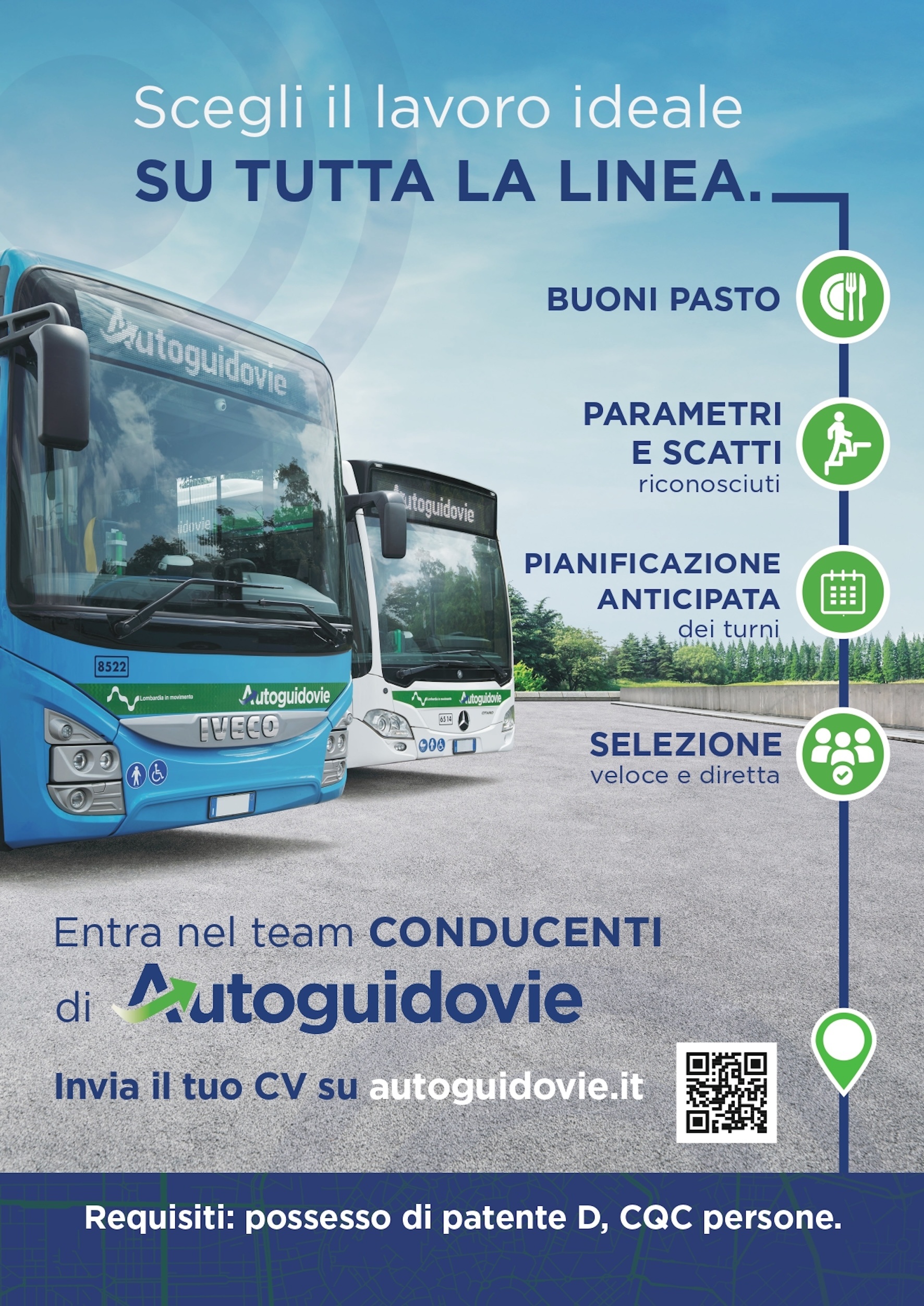 L’inquadramento contrattuale offerto è a tempo indeterminato (o di apprendistato) CCNL Autoferrotranvieri con tredicesima e quattordicesima, e prevede il riconoscimento dell’effettiva anzianità pregressa del lavoratore, scatti e parametro. Per ogni giorno di lavoro vengono assegnati buoni pasto del valore di 8 euro e sono corrisposte provvigioni sulla vendita a bordo dei biglietti, laddove il servizio è attivo. Fanno parte del “pacchetto” numerosi benefit come formazione professionale e rinnovo patenti a carico della società; convenzioni con molteplici brand di sport, moda, tecnologia e altro che danno accesso a immediate scontistiche; polizza sanitaria integrativa TPL Salute; previdenza complementare Fondo Priamo con contributo aziendale e assistenza fiscale gratuita per la compilazione annuale del 730. Viene infine garantito un processo di selezione veloce e diretto.