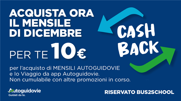 Un cash-back per premiare gli studenti che si sono registrati al servizio Bus2school e che acquisteranno entro il 5 dicembre un titolo mensile attraverso l’App Autoguidovie.