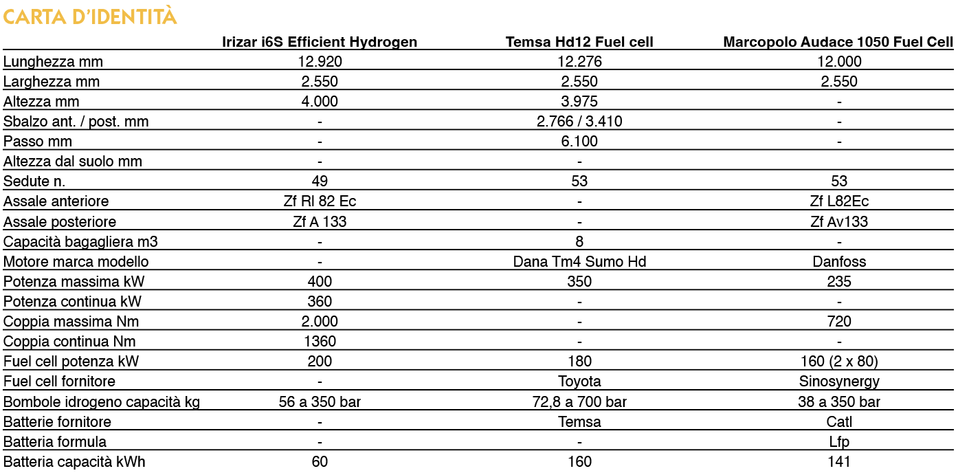 Il modulo a celle a combustibile (qui, come anticipato, è sensato pensare a un fornitore partner) ha una potenza dichiarata in scheda tecnica di 200 kW, un valore che stacca in maniera decisa i 100 o 120 solitamente montati sui bus urbani. È collocato sul retro, nello spazio lasciato libero dal motore a combustione. La capacità della batteria è di 60 kWh, mentre quella dei serbatoi di idrogeno è di 56 kg, con compressione a 350 bar. Nel caso della versione a tre assi, i chili di idrogeno ospitabili a bordo salirebbero fino a 78.