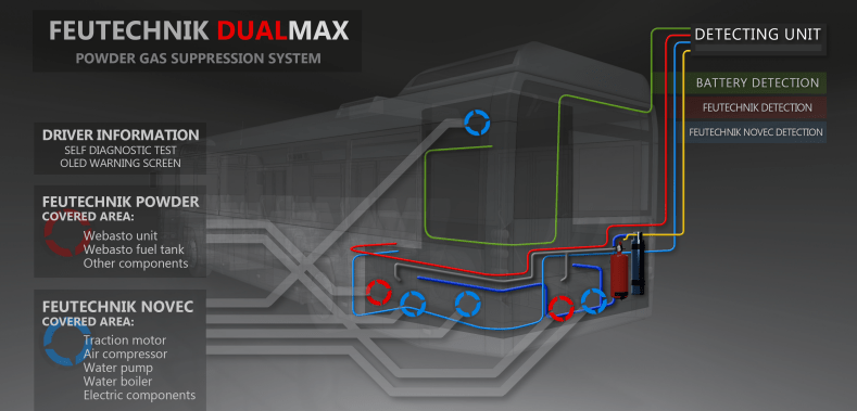 Rivelazione, attivazione e segnalazione istantanea, estinzione rapida, inibizione al reinnesco di un incendio a bordo autobus. Sono queste le caratteristiche dei sistemi di estinzione incendi FeuTechnik Max omologati per autobus a gasolio, metano, ibridi, idrogeno, elettrici. Grazie al sistema di ri...