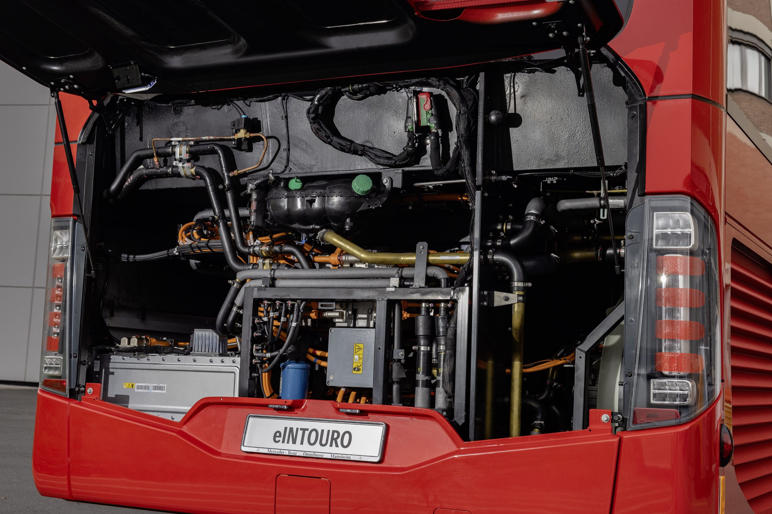 A differenza dell’eCitaro, per l’Intouro elettrico sono state scelte nuove batterie di tipo Lfp, le medesime usate anche sul truck eActros, assemblate in due grossi gruppi capaci di 207 kWh cadauno. Uno solo il gruppo di serie, montato subito dietro l’assale anteriore, occupando circa un metro lineare di bagagliera, che si assesta a circa 4 metri cubi per il 12 metri, 6 per il 13 metri. Il secondo, opzionale, è sistemato nell’ampio vano posteriore, il quale ospita il motore, l’inverter di trazione e l’impianto di raffreddamento degli impianti ad alta tensione. La tecnologia Lfp, oltre ad essere più economica, consente lo sfruttamento del 95 per cento dell’energia immagazzinata e, presentando una buona curva di decadimento, permette di raggiungere una vita utile fino a quindici anni, almeno in determinate condizioni di servizio.Â