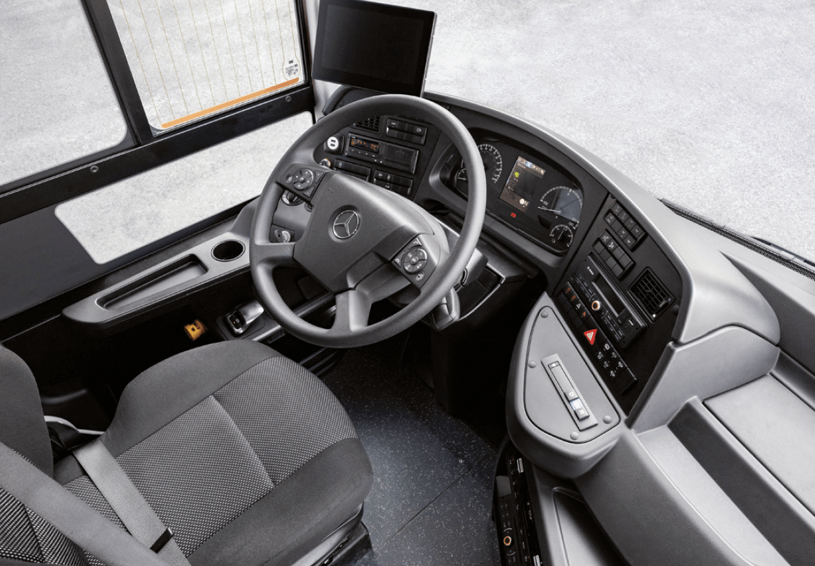 Il posto guida risulta adeguato a ospitare conducenti di tutte le taglie, così come il cruscotto ricorda quello di un autobus da turismo, completo di tutte le informazioni necessarie al servizio. Il display centrale è mutuato dell’eCitaro: un misuratore di potenza sostituisce il contagiri e indica l’istantaneo fabbisogno di energia o il recupero. Nel display sono anche presenti le informazioni sullo stato di carica delle batterie, l’autonomia residua, la disponibilità di energia.