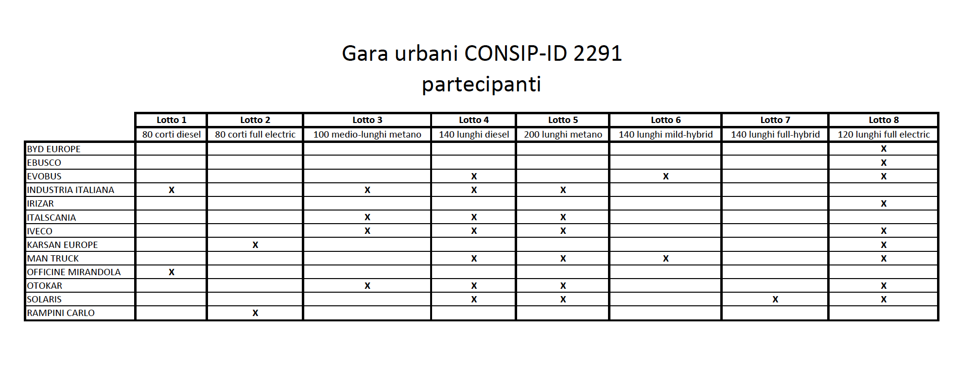 - Lotto 8: Man, Solaris, Otokar, Iveco, Irizar, Evobus, Bbusco, Karsan, Byd