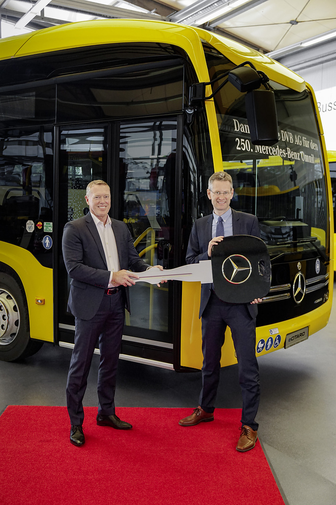 Rüdiger Kappel, Fleet Sales Manager di Daimler Buses Germania, ha consegnato personalmente il veicolo: «Forniamo autobus a DVB da oltre 30 anni e siamo orgogliosi che abbiano fiducia nella qualità dei nostri prodotti. Con gli autobus elettrici a zero emissioni, vogliamo contribuire a rendere il centro di Dresda più attraente e degno di essere vissuto».