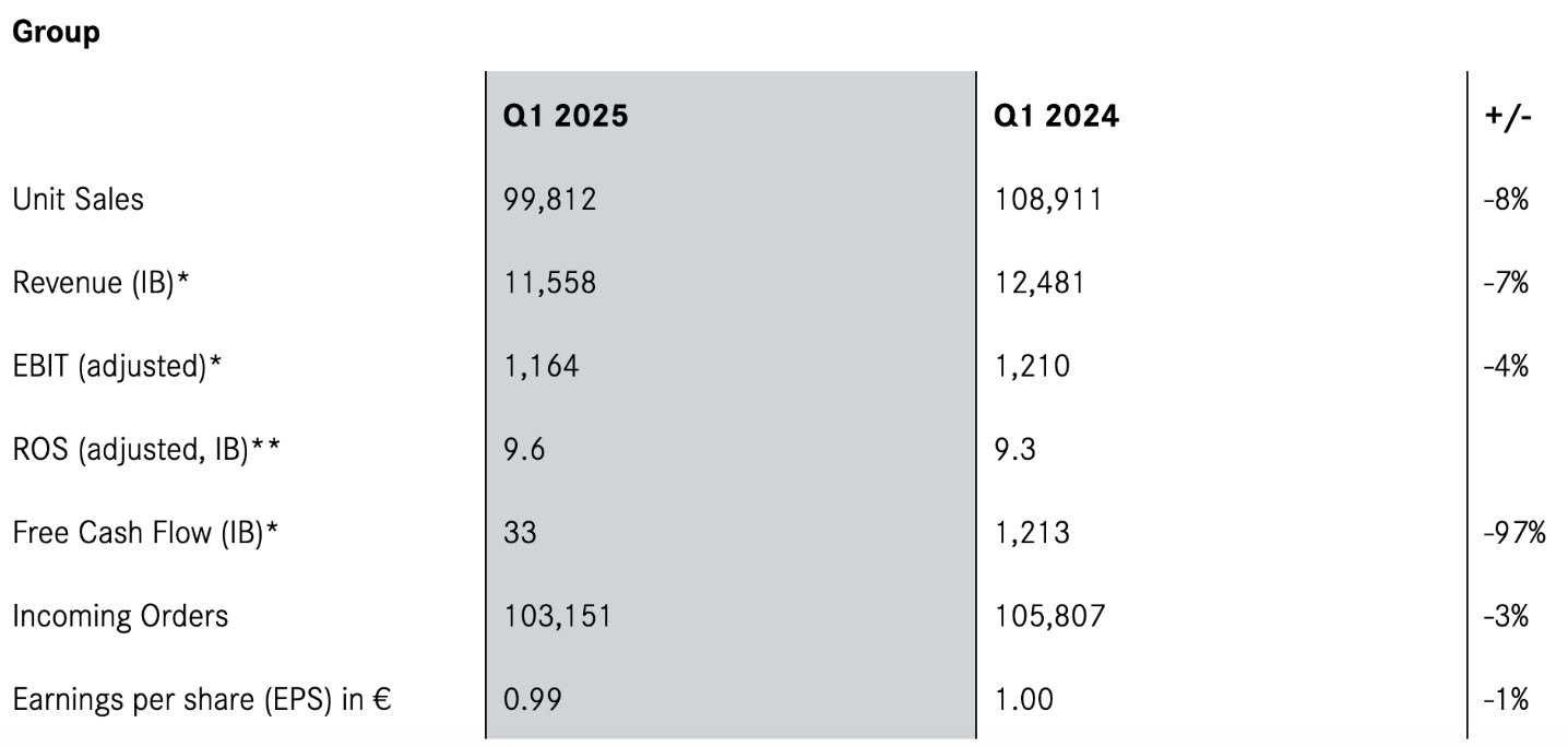 A livello di gruppo, Daimler Truck ha registrato 11,6 miliardi di euro di ricavi del settore industriale, in calo rispetto ai 12,5 miliardi di euro del 1° trimestre 2024, e 1,16 miliardi di euro di EBIT di gruppo rettificato, rispetto agli 1,21 miliardi di euro dello stesso periodo dell’anno precedente. Il free cash flow delle attività industriali è sceso a 33 milioni di euro, dopo aver raggiunto 1,2 miliardi di euro nel primo trimestre del 2024.