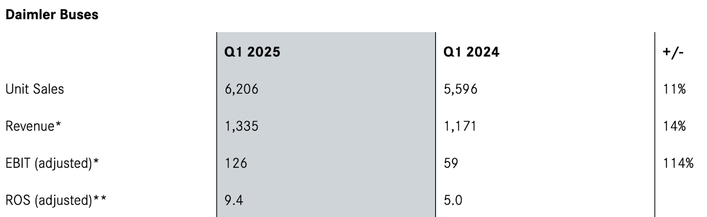 In un trimestre in cui il rendimento industriale del Gruppo sulle vendite (ROS rettificato) è salito al 9,6% (dal 9,3% del primo trimestre 2024), Daimler Buses è stata uno dei motori della redditività. Questa performance è avvenuta in un contesto di calo dei volumi di vendita complessivi: Daimler Truck ha consegnato 99.812 veicoli a livello globale, rispetto ai 108.911 del primo trimestre 2024 (-8%).