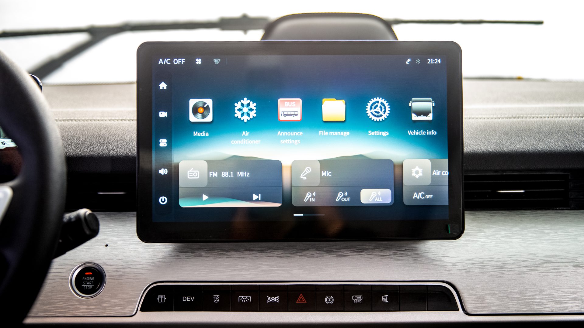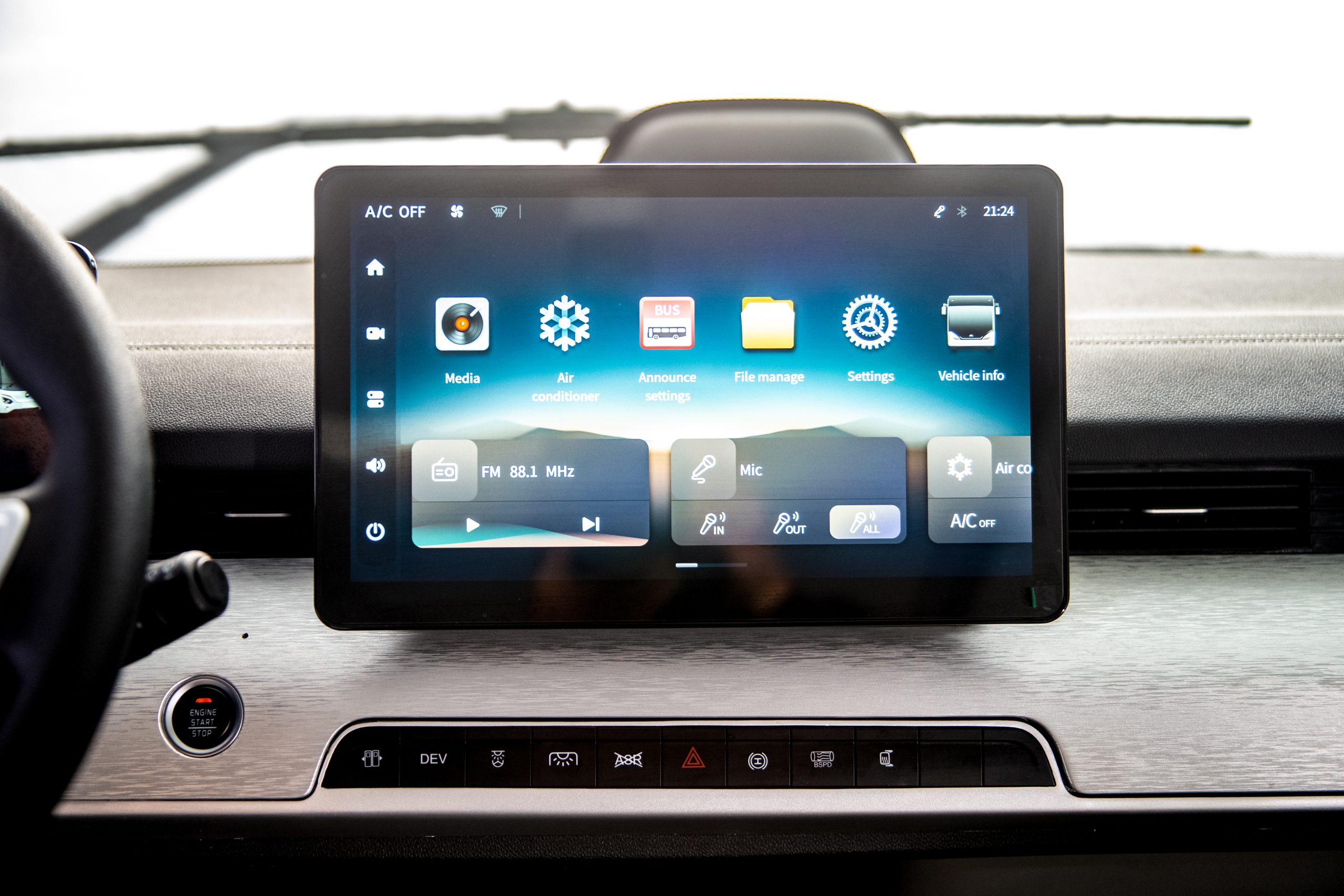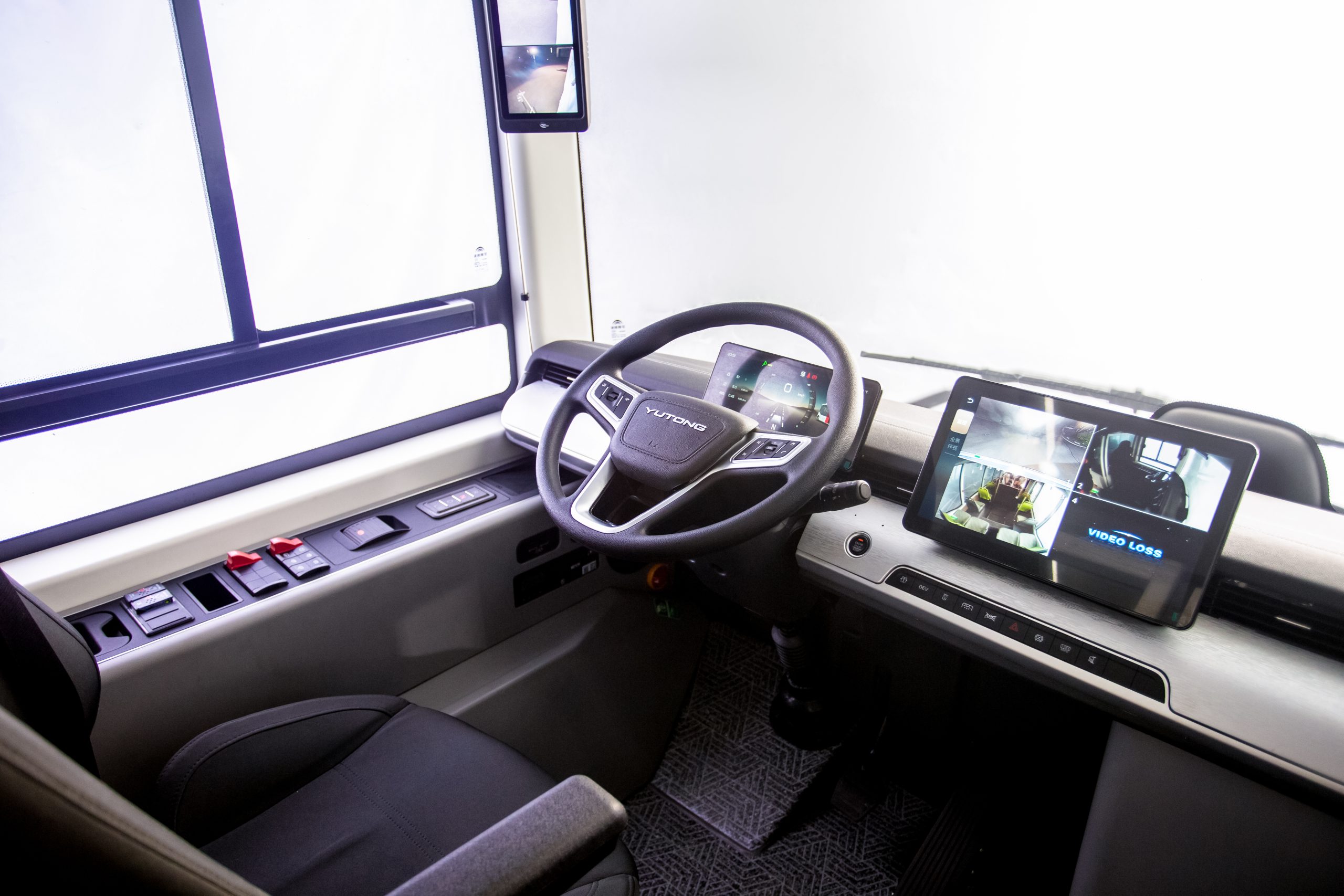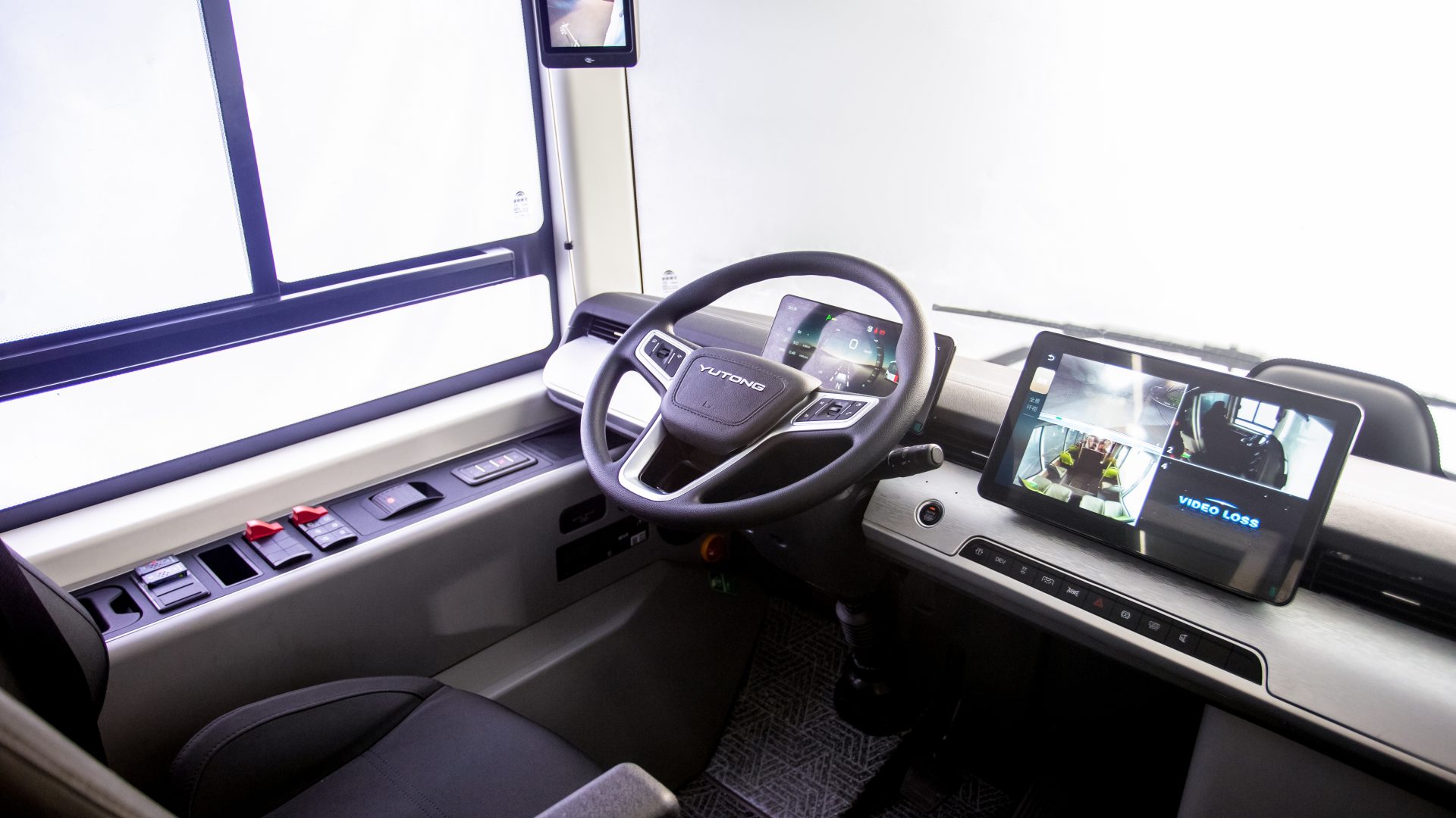 Passiamo ora a dare un’occhiata all’area di guida del minibus elettrico E7S di Yutong, che dispone di un cruscotto ultramoderno simile a quello delle auto più moderne, completo di due display digitali (da 10,25 pollici e 12,8 pollici) e un volante multifunzione dotato di tasti. Il sedile del conducente è ergonomico e dotato di airbag.