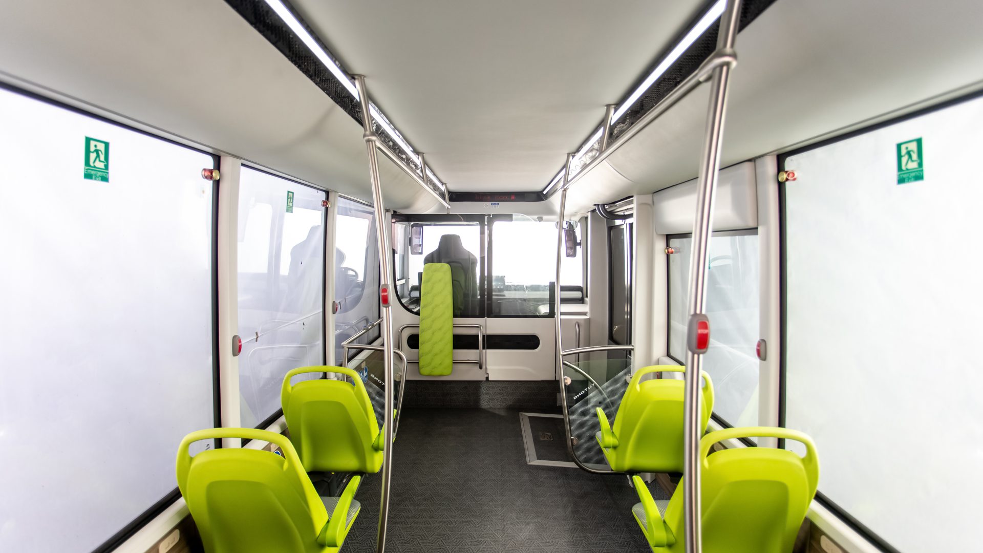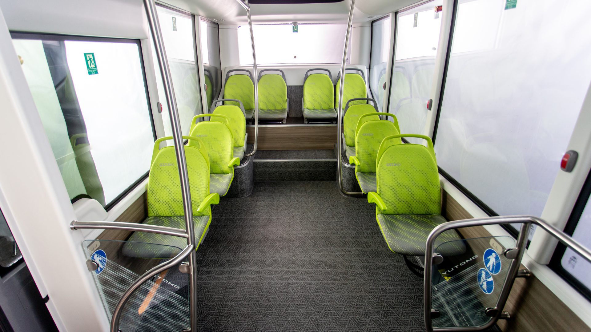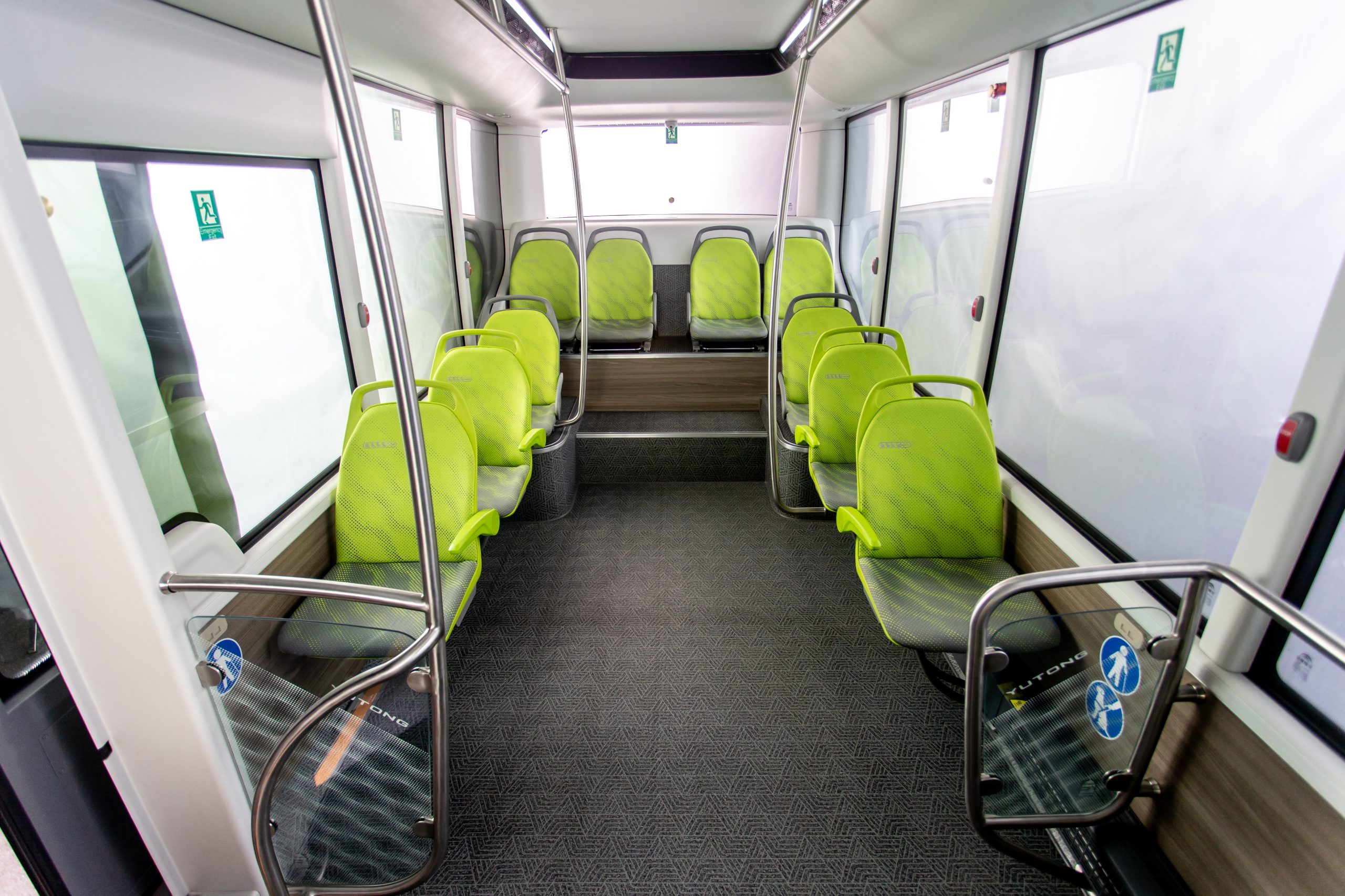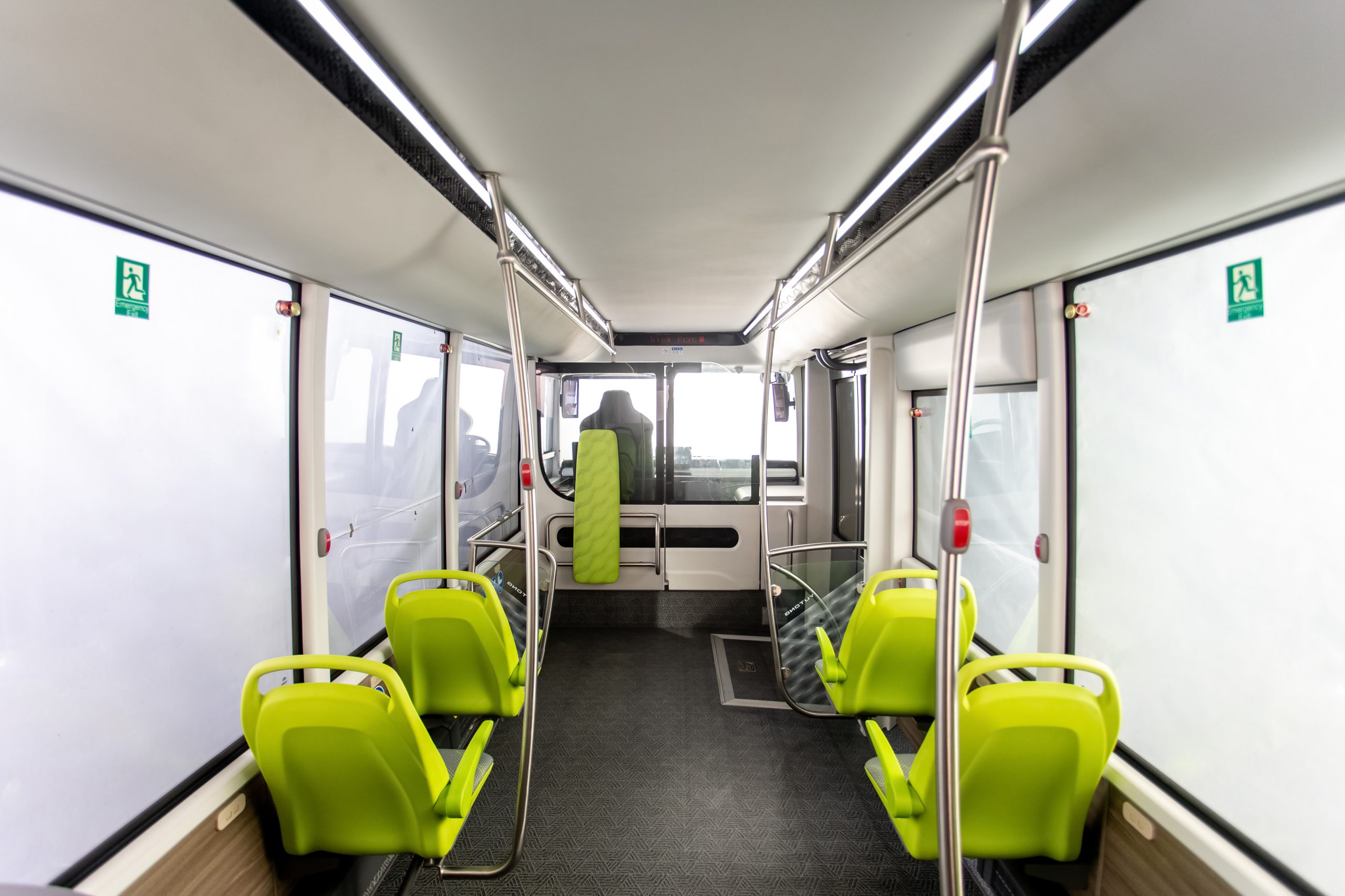 Ora entriamo nel vano passeggeri dell’E7S. Le porte sono molto spaziose, con una larghezza di 1,2 metri, rendendo l’entrata e l’uscita più comode. Il gradino inclinato è a soli 270 mm dal suolo (aspetto che facilita la salita e la discesa) e sono presenti aree appositamente dedicate agli anziani, ai bambini e alle persone disabili. L’area passeggeri può ospitare fino a 10 posti a sedere, estendibili fino a 13, con una capacità massima di 30 persone, grazie ai suoi 3,8 metri quadrati di spazio a pavimento, che la rendono la più grande tra i minibus disponibili sul mercato.