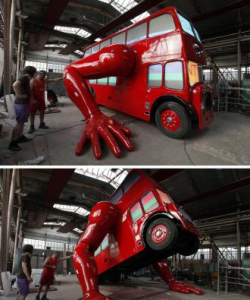Ultimi ritocchi all’enorme scultura dell’artista David Cerny che ha trasformato un bus, simbolo di Londra, in un robot che si solleva come fosse un vero atleta. Ecco il bus mentre si solleva da terra. L’artista che lo ha creato spera che diventi la mascotte non ufficiale delle Olimpiadi di Londra 2012. La scultura-autobus รจ stata installata a Londra davanti al quartier generale della squadra della Repubblica Ceca.