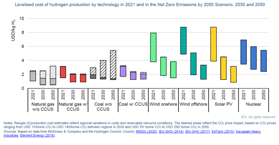 Il seguente grafico riporta (dati IEA 2022) un confronto dei costi (LCOH) di produzione di idrogeno al 2021 e le stime al 2030 e 2050. Si può notare come la tendenza sia di arrivare al costo di 1 €/kg al 2030. L’EPA in US ha recentemente rilasciato uno studio in cui afferma di poter riuscire a produrre idrogeno ad 1$/kg al 2032.