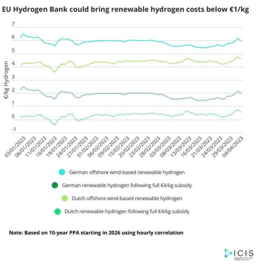 Assumendo che un produttore di H2 utilizzi energia rinnovabile tramite un power purchase agreement (PPA) decennale con partenza dal 2026 in Olanda, il costo dell’idrogeno sarebbe pari a 4,58 euro al Kg con un periodo di rientro del capex per gli impianti di elettrolisi stimano in 10 anni: ottenendo il massimo sussidio possibile, pari come detto a 4 euro al Kg, il produttore per raggiungere il break-even del progetto potrebbe vendere l’idrogeno sul mercato a meno di 1 euro al Kg. Ipotizzando invece di produrre idrogeno verde in Germania utilizzando energia rinnovabile proveniente da impianti eolici offshore, il costo finale sarebbe pari a 5,96 euro al Kg secondo le stime di ICIS: ciò significa che, con il sussidio massimo di 4 euro al Kg, il break-even sarebbe raggiunto vendendo l’idrogeno sul mercato a meno di 2 euro al Kg.