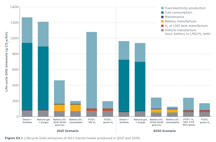Riguardo alle emissioni di gas clima alteranti (CO2 eq), recentemente la ICCT ha presentato un report in cui confronta dati del recente passato (2021) con una previsione al 2030 in cui, per quanto concerne la situazione attuale (al 2021) gli autobus elettrici (battery EV renewables) e quello ad idrogeno (FCEV green H2) hanno una valore di emissioni praticamente uguali (200 gCO2 e /km) ma con contributi ben diversi: nel caso dei veicoli a batteria è preponderante il contributo della costruzione delle batterie, mentre per quelli ad idrogeno il contributo rilevante è quello per la produzione dell’idrogeno. Questo significa che per una analisi affidabile della riduzione delle emissioni utilizzando veicoli elettrici (a batteria o a idrogeno) è necessario fare uno studio dell’intero ciclo di vita (LCA) basato sugli standard internazionali (ISO 14044).