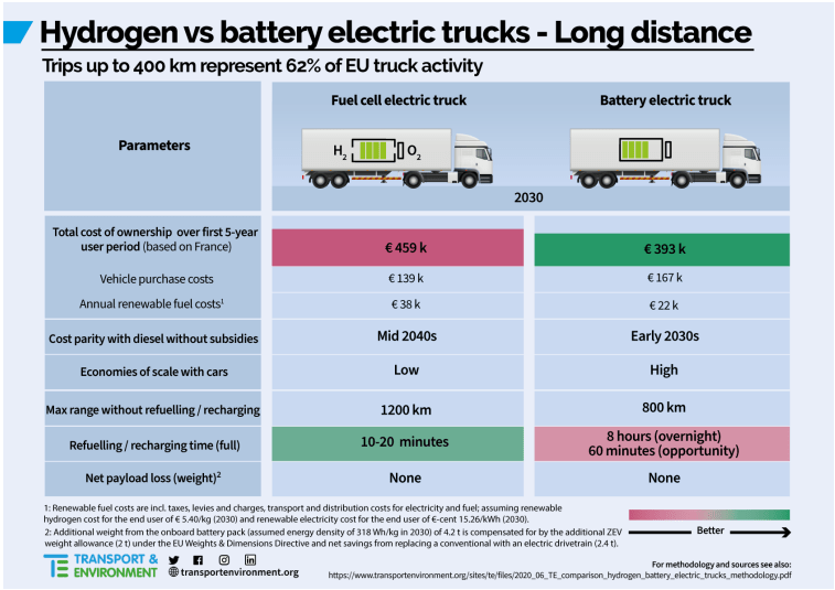 Un confronto, relativo ai camion per il trasporto pesante, mostra come il TCO (Total Cost of Ownership) per i primi 5 anni di utilizzo sia sfavorevole per i veicoli ad idrogeno rispetto a quelli a batteria, ma vogliamo evidenziare come il vantaggio dei veicoli ad idrogeno si manifesta chiaramente nei tempi di ricarica e nel range di percorrenza senza ricarica. Questo dovrebbe quindi spostare le decisioni strategiche ad analizzare certamente i costi, ma anche la capacità di gestione dei mezzi e la progettazione dei parchi per le ricariche / rifornimenti e quindi infrastrutture, ma soprattutto servizi che riferite invece agli autobus dovrebbero privilegiare prestazioni e flessibilità che invece ne verrebbero compromessi da una parte per i tempi di ricarica e dall’altra per un disallineamento della produzione rinnovabile ad esempio fotovoltaica di giorno, rispetto alla carica che verrebbe di notte, costringendo ad un prelievo dalla rete e non un autoconsumo.