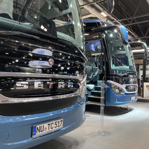La casa di Stoccarda ha esposto un terzetto di coach Setra, facenti parte della gamma recentemente ristilizzata, l’immancabile eCitaro (in versione con batteria aggiornata in grado di stoccare fino a 490 kWh sul 12 metri), un telaio diesel Euro VI, l’Intouro Hybrid e un Setra S 416 LE business.