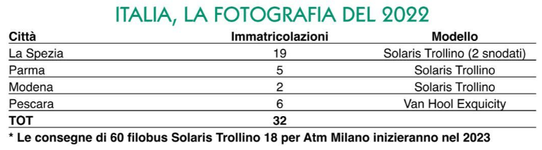 L’Italia si conferma una delle realtà più interessanti a livello continentale. Milano fa la parte del leone, con ben 60 nuovi Solaris Trollino snodati ordinati (le consegne inizieranno nelle prime settimane del 2023: i veicoli fanno parte dell’accordo quadro tra Atm e Solaris per la consegna di 80 più 10 nuovi veicoli).