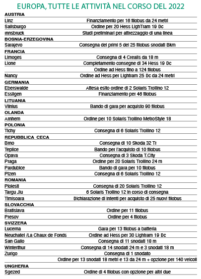 Molto attiva la Francia. A Limoges sono in arrivo quattro Crealis con parte elettrica Skoda (i veicoli sono stati provati a Plzen nell’estate 2022). A Lione sono state completate nel 2022 le consegne, iniziate nel novembre 2021, dei 34 snodati LighTram costruiti da Hess, mentre è del dicembre 2022 l’ordine di acquisto ad Hess di nuovi filobus (si parla di 124 veicoli). Sempre Hess fornirà a Nancy 25 filobus a doppio snodo, da 24 metri. Anche a S.Etienne è stata completata la fornitura di 23 Solaris Trollino da 12 metri.