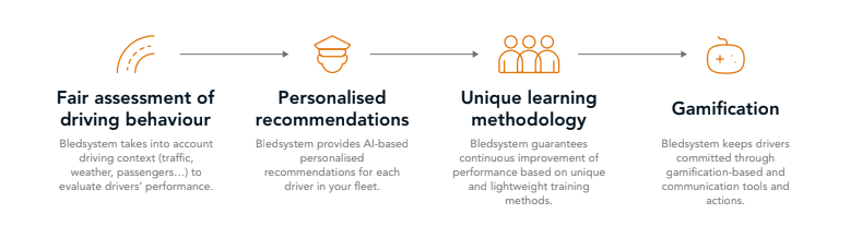 - Valutazione equa della guida: prendendo in considerazione il contesto di guida, comprese le condizioni del traffico, le condizioni meteorologiche, i dati cartografici e persino il numero di passeggeri, Bledsystem garantisce il comportamento dei conducenti sia valutato solo in condizioni comparabili e quindi nel modo più equo possibile.