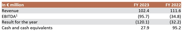 Nel 2023 Ebusco ha realizzato 102,4 milioni di euro di ricavi, registrando un EBITDA negativo di 95,7 milioni di euro, rispetto ai 34,8 milioni di euro negativi dell’anno precedente, e una perdita netta dell’anno di 120,1 milioni di euro (contro i 32,2 milioni di euro del 2022).