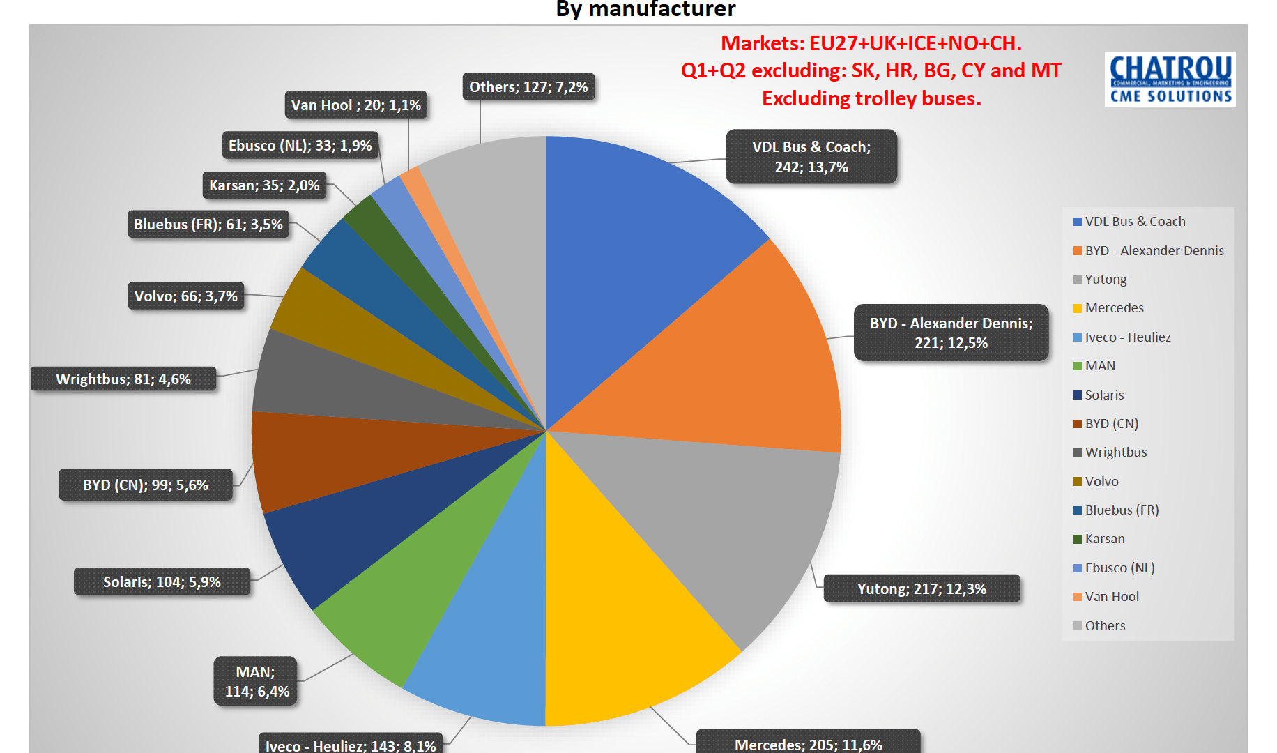 Sempre secondo i dati di Chatrou CME Solutions, il 64,5% di tutti gli autobus urbani nei 26 Paesi ha ora una trasmissione alternativa (era il 59,4% per l’intero anno 2021 e il 52,5% per l’intero anno 2020). La quota di autobus ibridi sta diminuendo: dal 24 al 14%, «a causa del passaggio all’elettrico (Germania) o al Cng (Spagna e Italia)», osserva la società di consulenza.