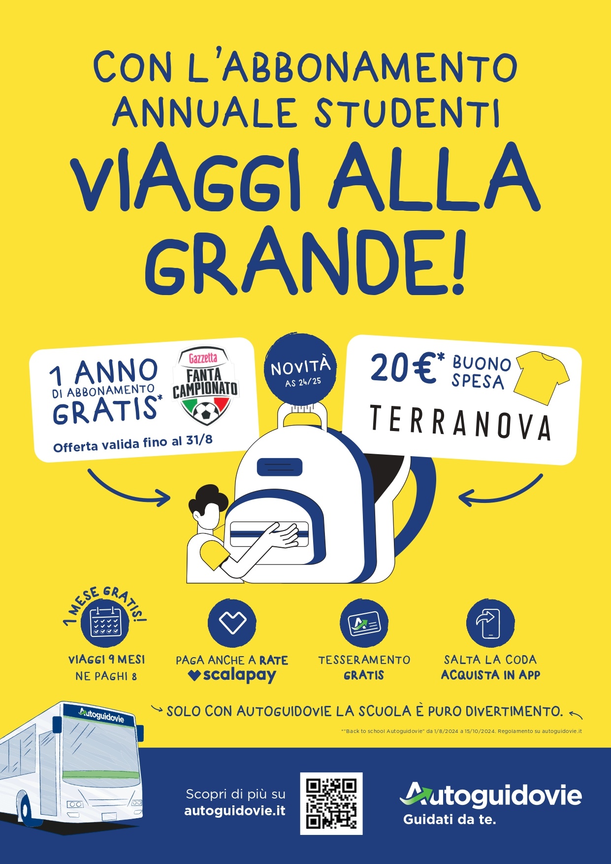 Solo con l’acquisto dell’abbonamento annuale studenti Autoguidovie sono inclusi: abbonamento a 1 anno di Fantacampionato e La Gazzetta dello Sport in versione digitale, del valore di 29,90 euro (solo per acquisti in agosto da App Autoguidovie e sito, operazione a premi) e un buono spesa del brand di abbigliamento Terranova del valore di 20 euro da spendere online e nei negozi fisici fino a giugno 2025 (per l’acquisto di abbonamento effettuato da agosto a settembre da tutti i canali Autoguidovie, operazione a premi). In totale i vantaggi di questo rientro a scuola per gli studenti raggiungono i 60 euro di valore economico.