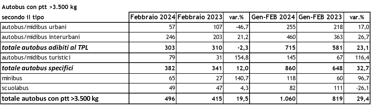 Il mercato dell’autobus italiano registra 496 immatricolazioni (+19,5%) a febbraio 2024. I dati Anfia