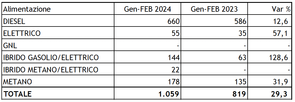 Secondo l’alimentazione, la quota di mercato degli autobus alimentati gas è del 16,8% a gennaio-febbraio 2024 (contro il 16,5% dei primi due mesi del 2023), mentre gli elettrici, ibridi gasolio/elettrico e ibridi metano/elettrico rappresentano il 20,9% (12% a gennaio-febbraio 2023).Â