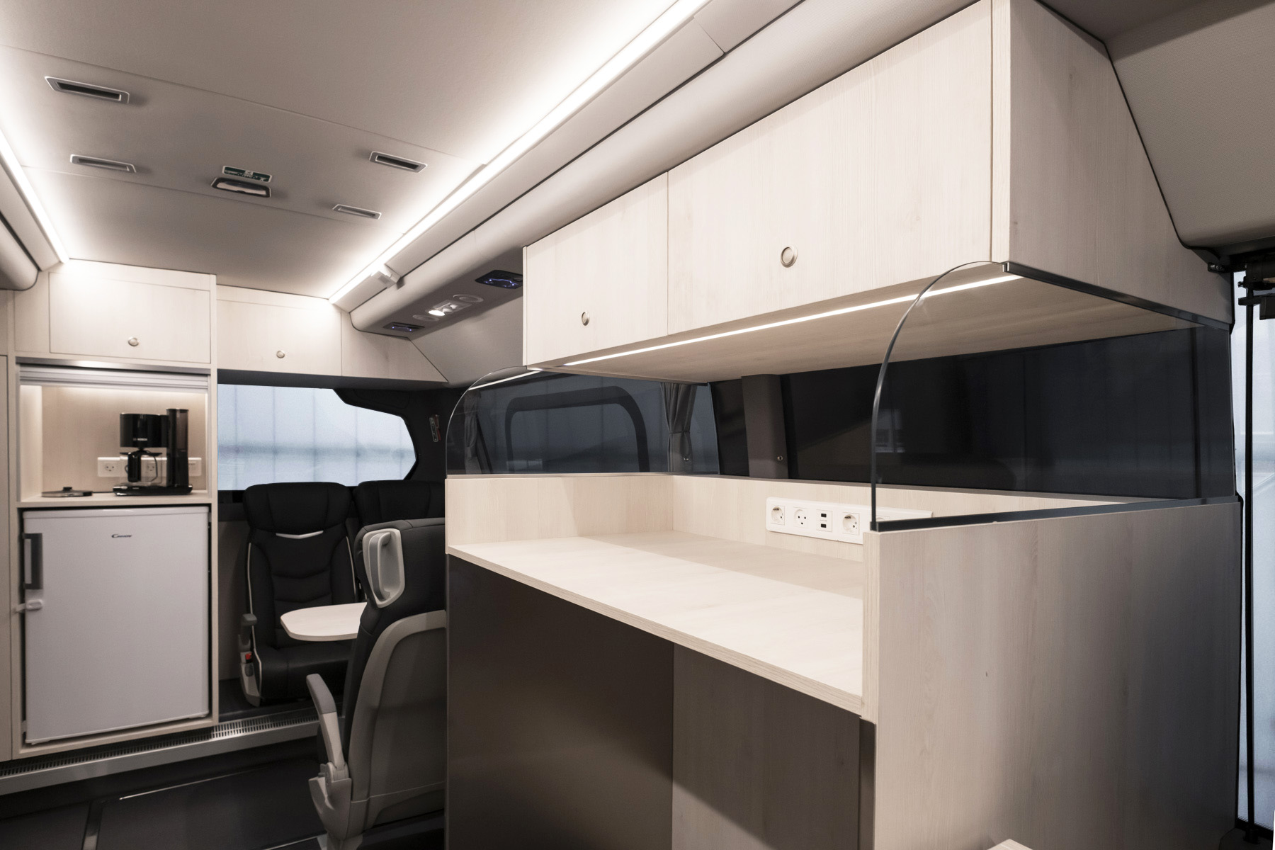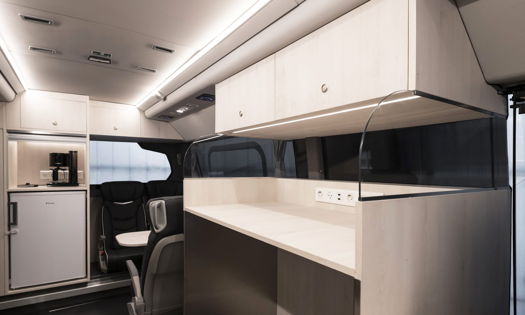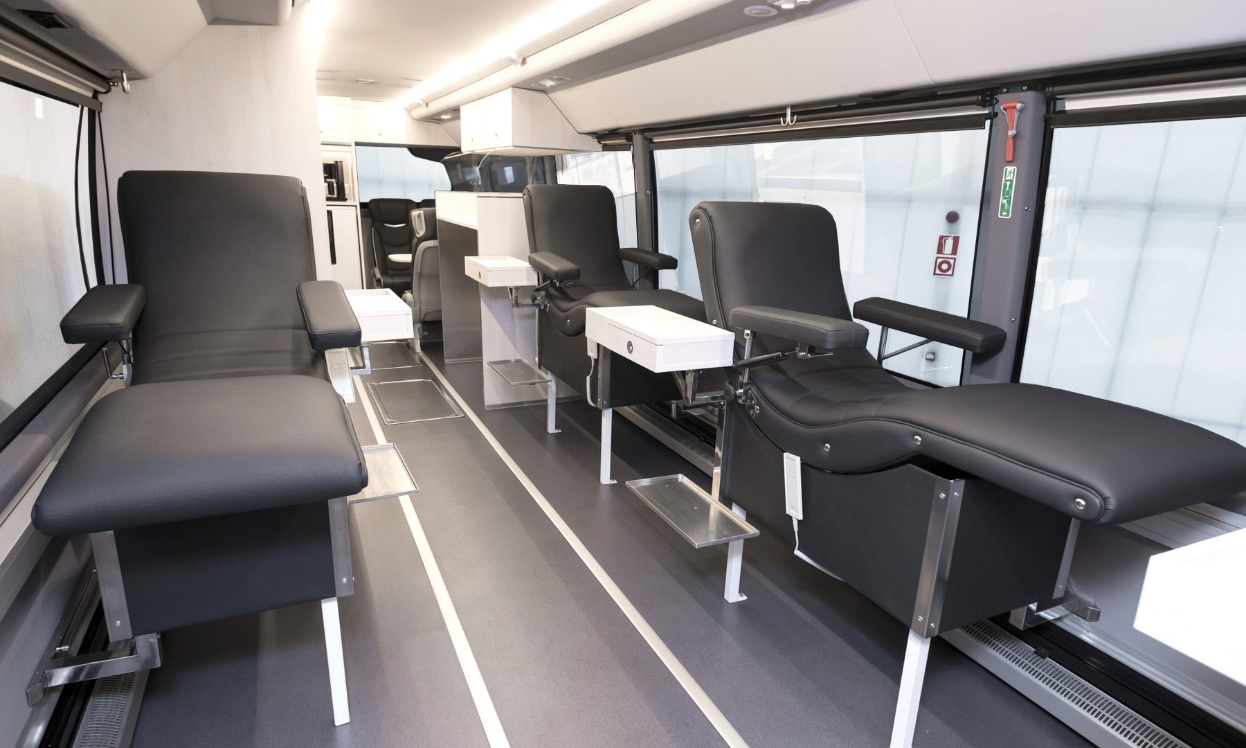 L’autobus è suddiviso in diverse aree: zona attesa e colloquio con il medico, zona donazioni, zona cucina e zona riservata al personale sanitario. La parte posteriore del veicolo ha quattro posti per il team medico, così come un ascensore per facilitare l’accesso al veicolo. Sono state installate barelle di alta qualità per il comfort e la comodità dei donatori, con la possibilità di regolazione elettrica della posizione, così come tutte le attrezzature necessarie per effettuare le donazioni. Inoltre, sono state installate quattro gambe idrauliche per bilanciare la carrozza, garantendo così condizioni di lavoro ottimali per il team medico.